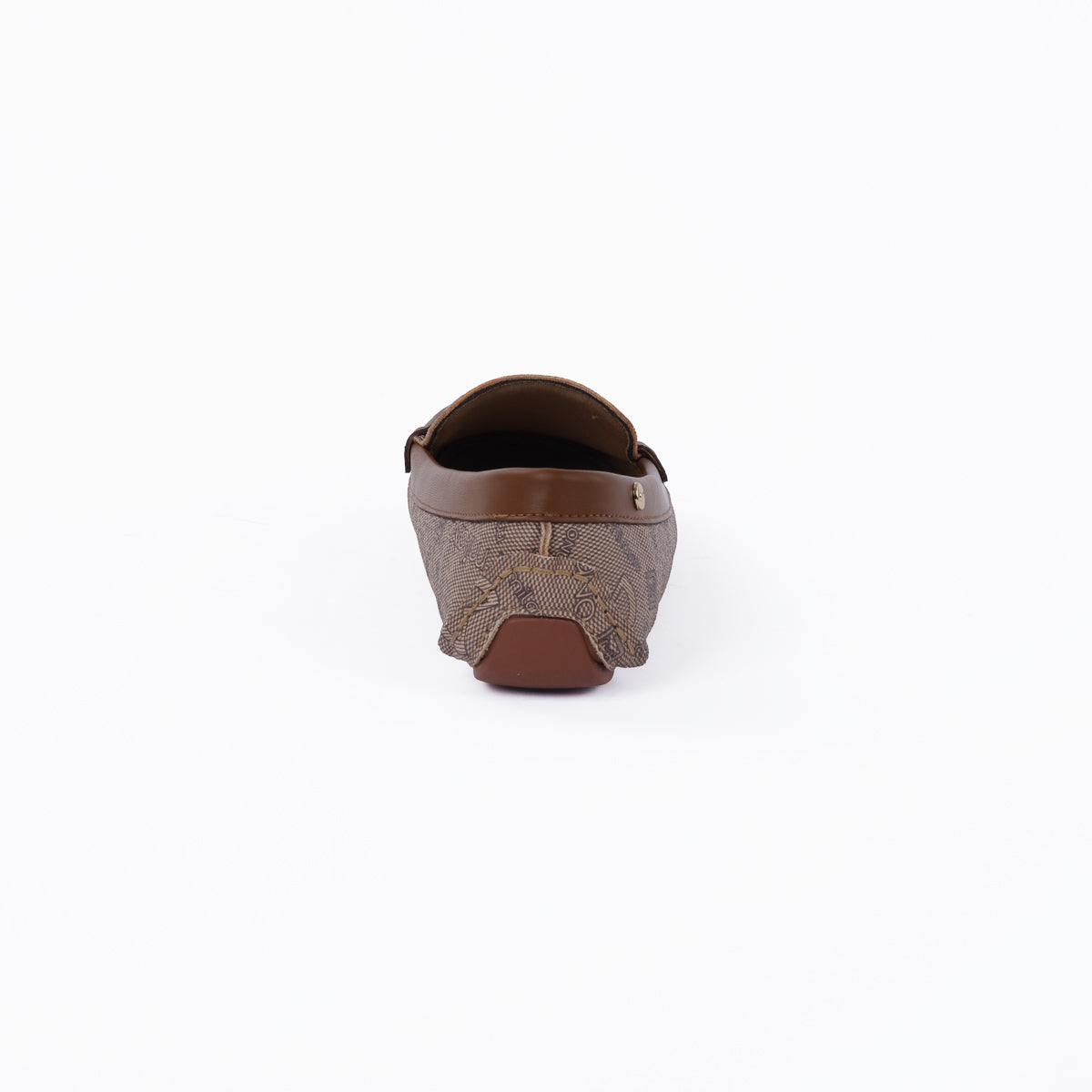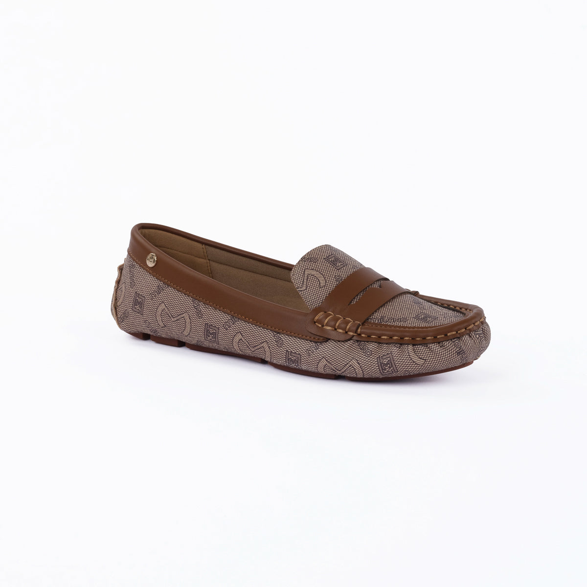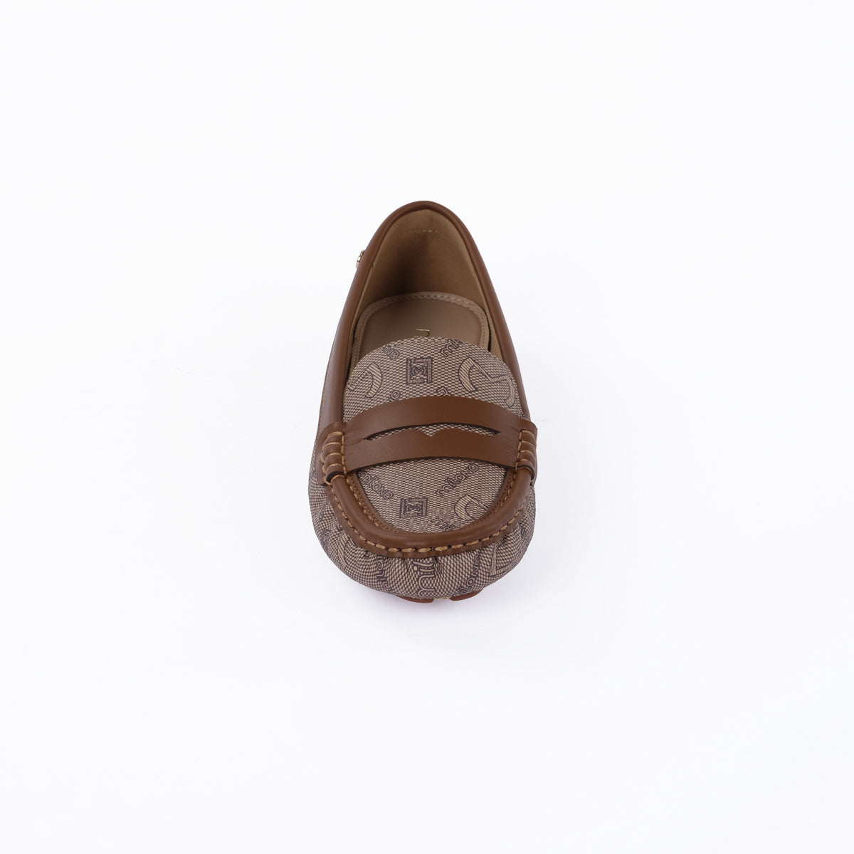 These stylish loafers feature a distinctive monogram printed upper in a harmonious brown and tan palette, perfectly complemented by rich solid brown trim and classic moc-toe stitching. A traditional penny loafer strap adorns the vamp, adding timeless appeal, while a discreet gold-toned accent button on the side completes the polished look. Designed for both style and comfort.