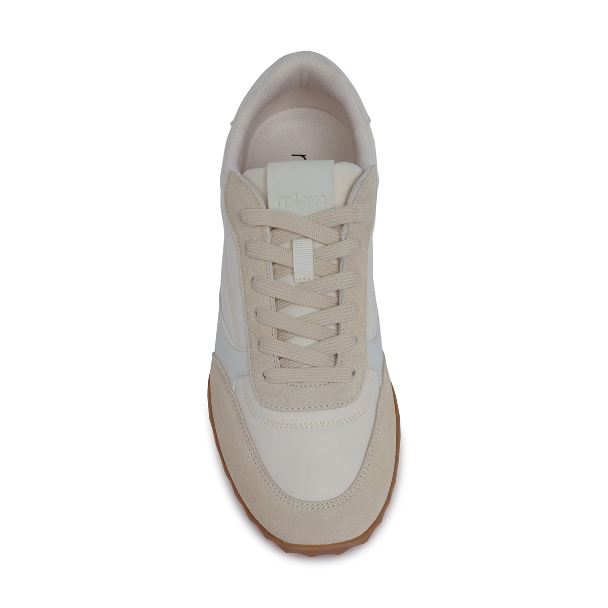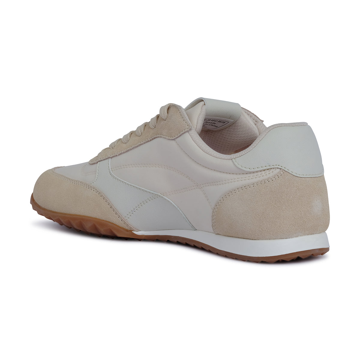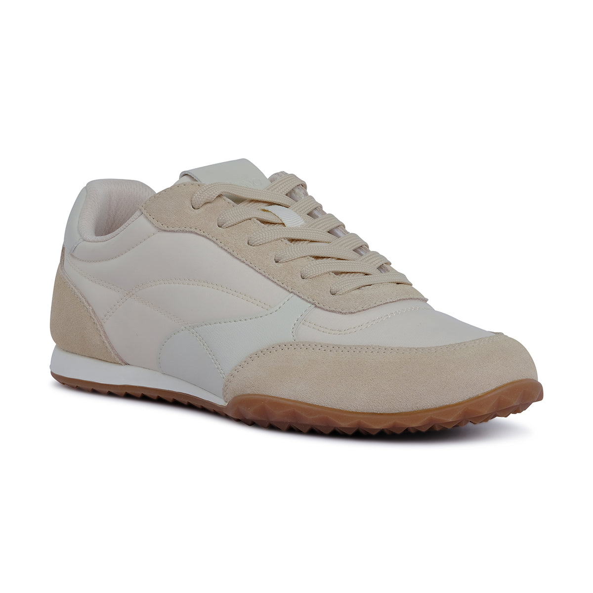 Sporty beige lace-up sneaker with sleek panel detailing, contrasting white accents, and a gum outsole. Designed for casual versatility and all-day comfort.