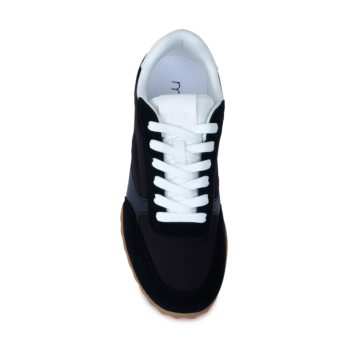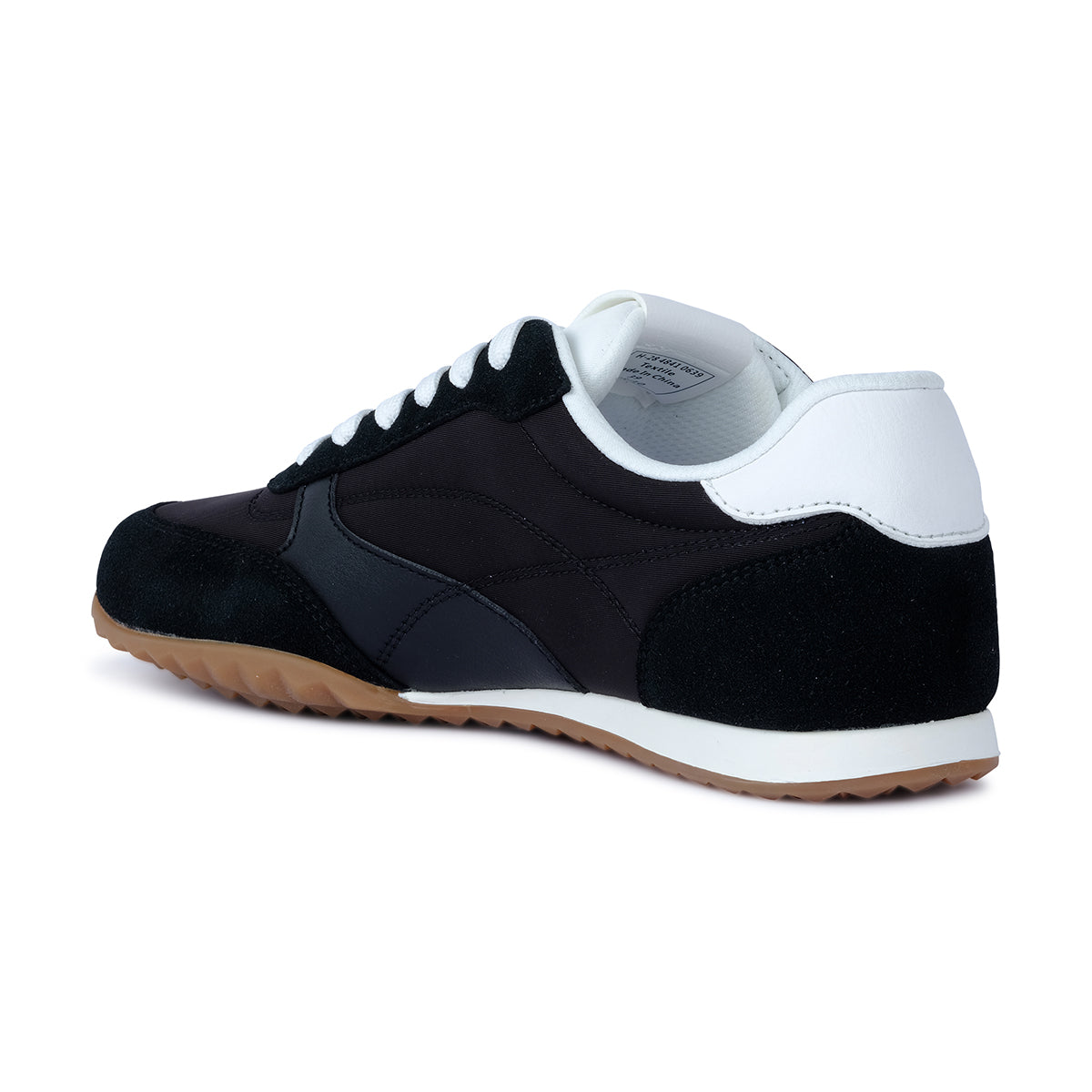 Sporty black lace-up sneaker with sleek panel detailing, contrasting white accents, and a gum outsole. Designed for casual versatility and all-day comfort.