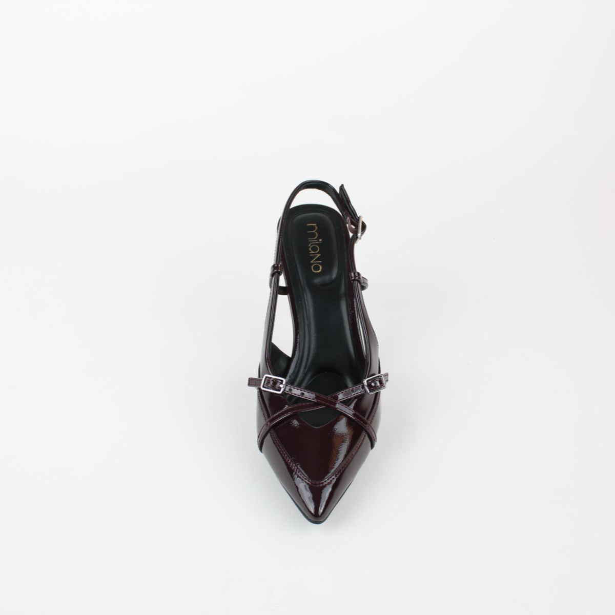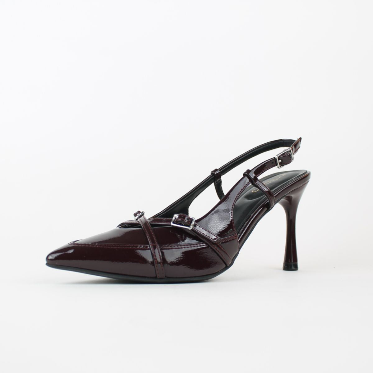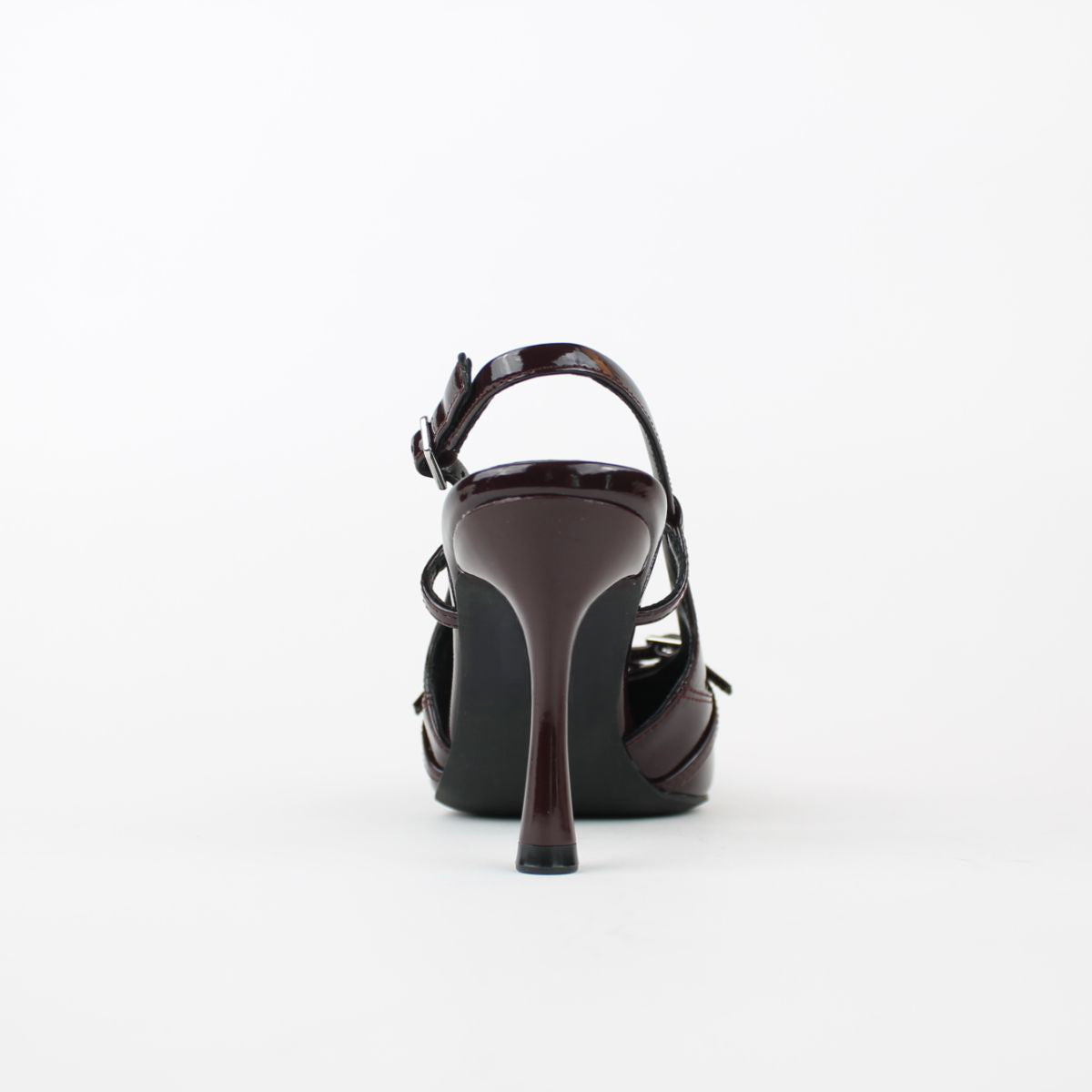 An elegant slingback heel in a rich patent finish. It features a pointed toe, a unique sculptural heel, and a straps detail, making it perfect for adding a sophisticated touch to any formal or evening outfit.
