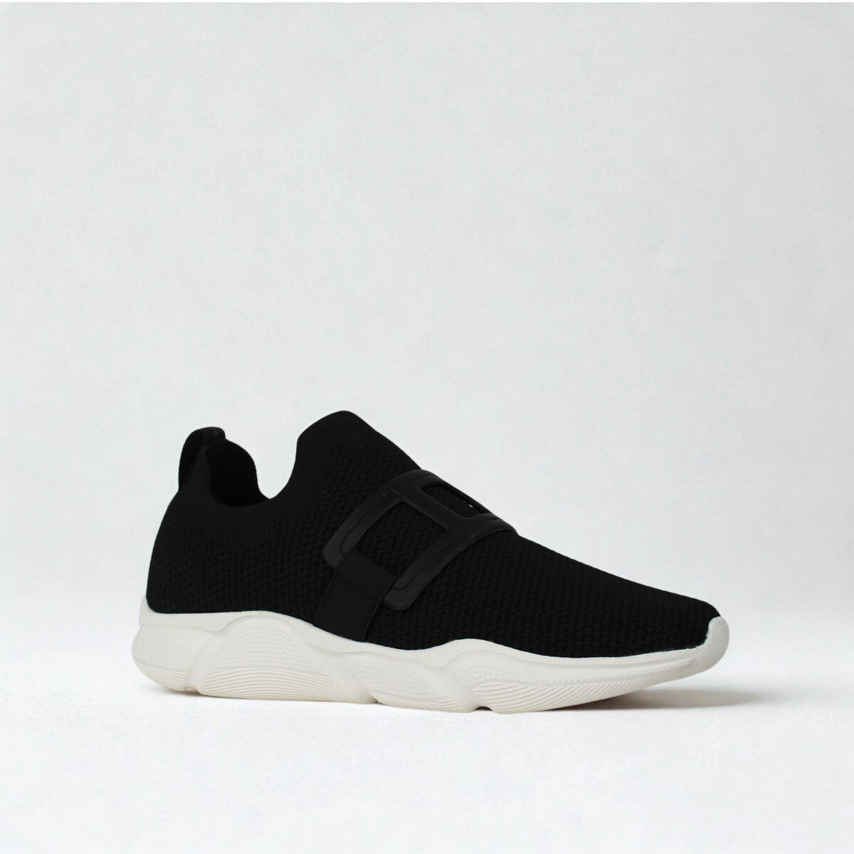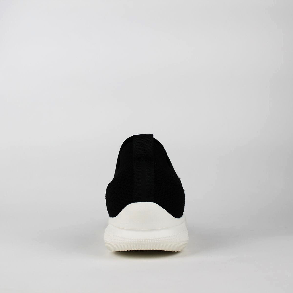 Stylish slip-on sneakers with a modern, minimalist design. The shoes feature a comfortable, sock-like knit upper and a bold, textured white sole. The sculpted sole provides both support and a unique, contemporary look.