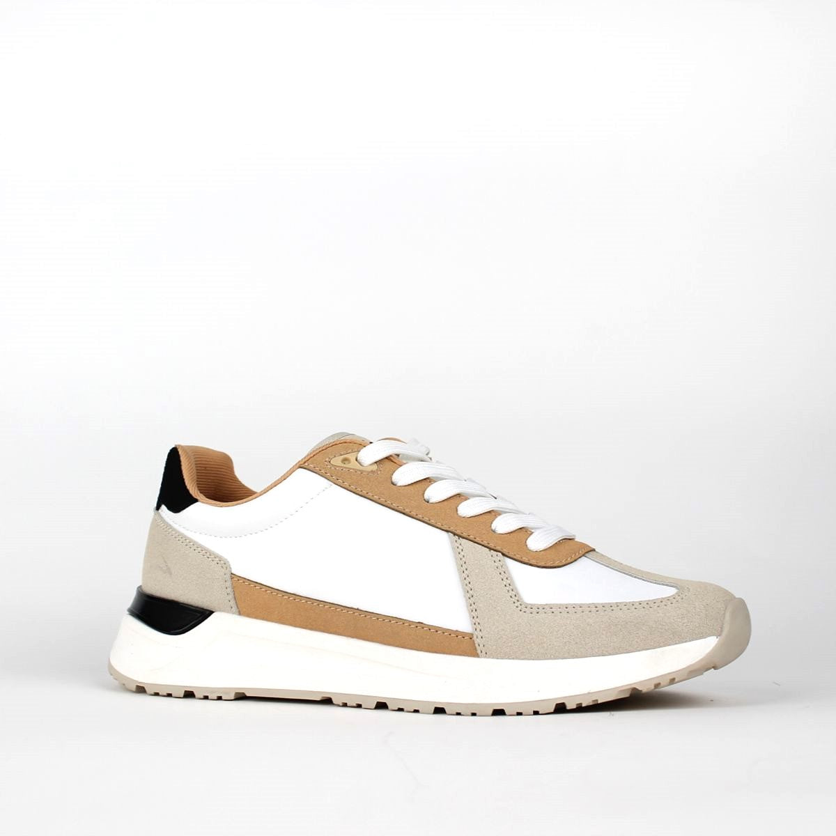Stylish and versatile, these trainers feature a contemporary multi-tone design. The upper combines smooth white panels with tan and beige suede-like materials for a dynamic look. These shoes are perfect for a casual, yet refined, everyday style.