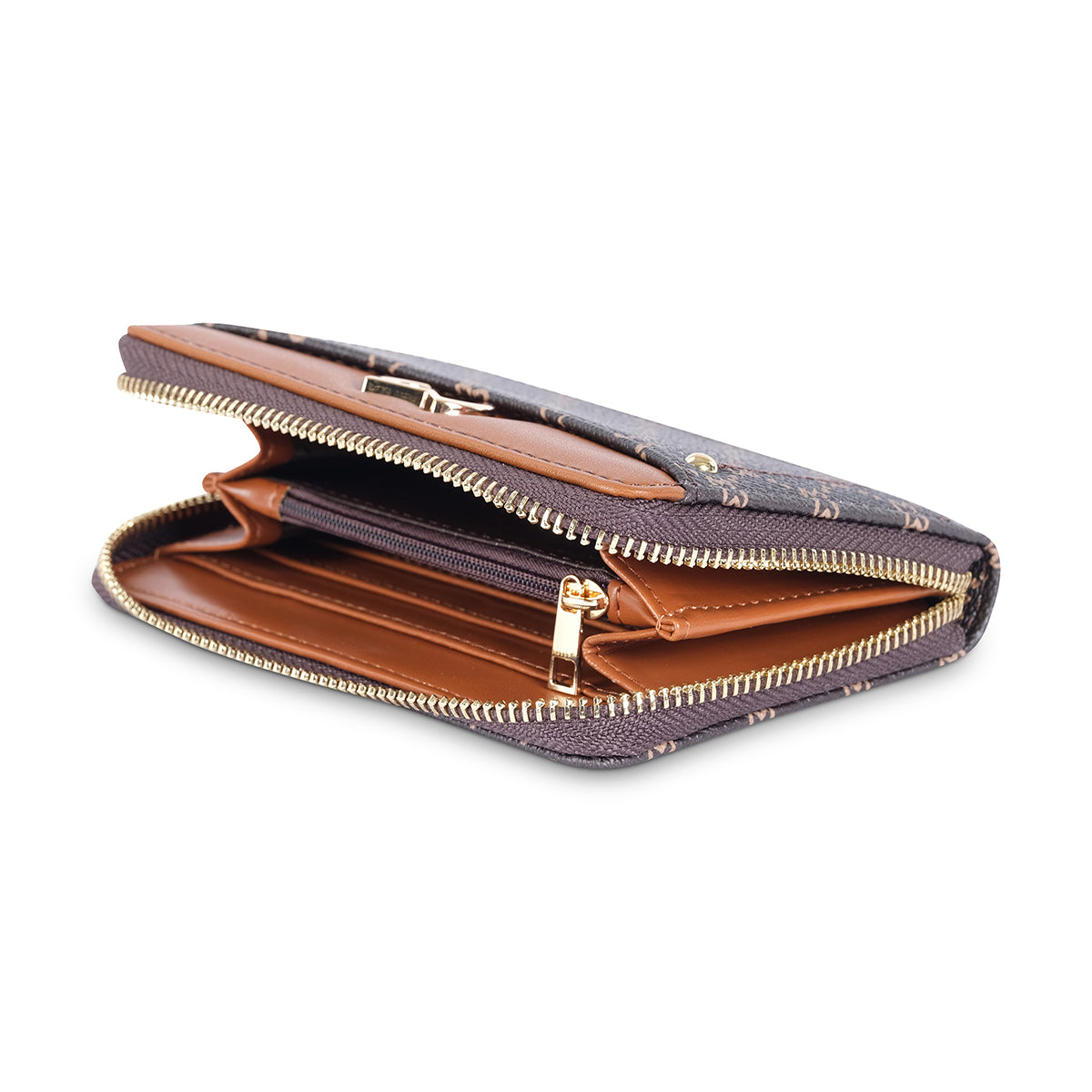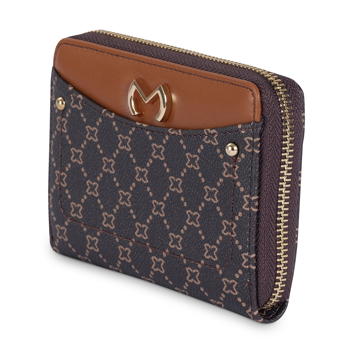Brown monogram ziparound wallet with contrasting Tan faux leather and M branded plate, ample card slots and internal coin pocket