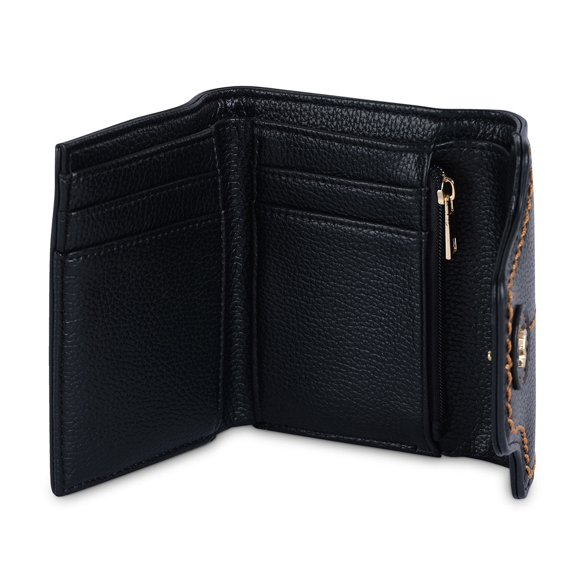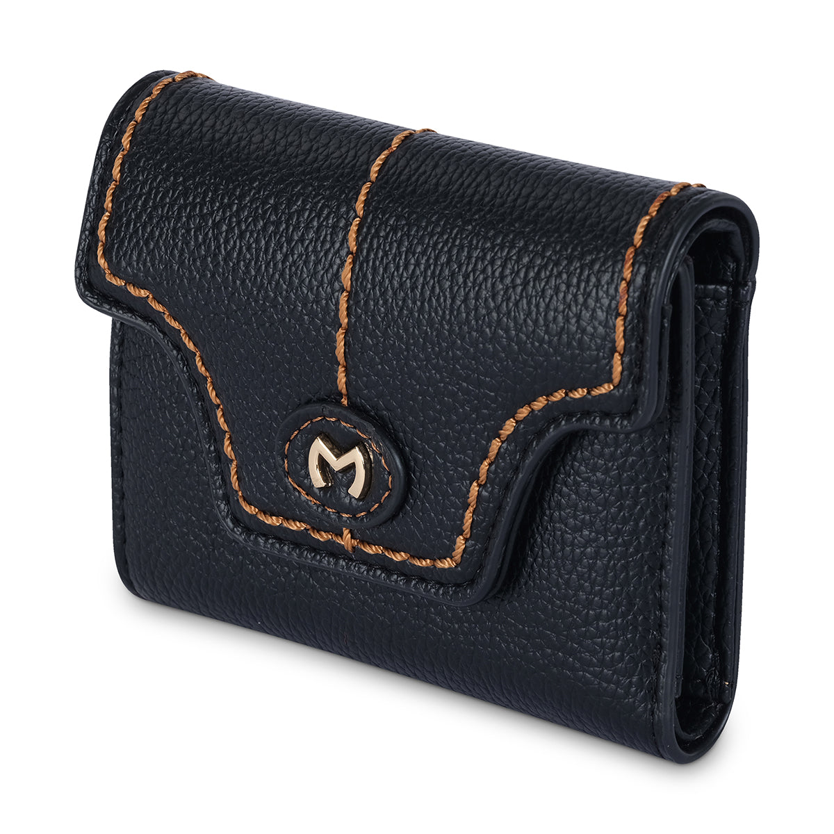 Black grainy faux leather wallet with sophisticated contrast detail, branded with our signature M plate.