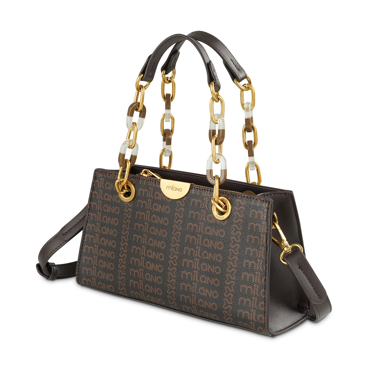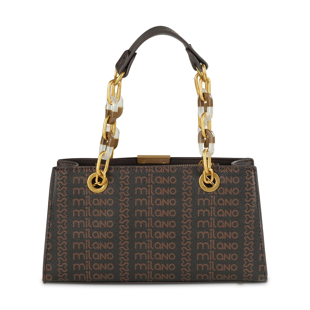 This Brown Milano monogram east-west grab bag comes with premium acrylic link handles and brass hardware, including a Milano branded plate adorning the topline. With zip closure, internal compartments and an additional long strap.