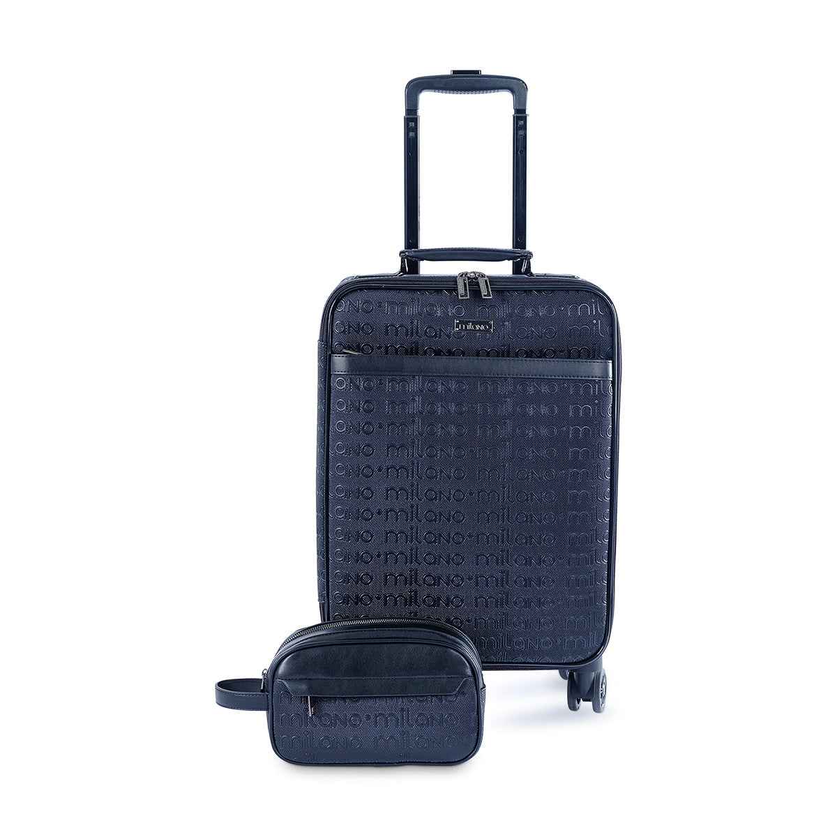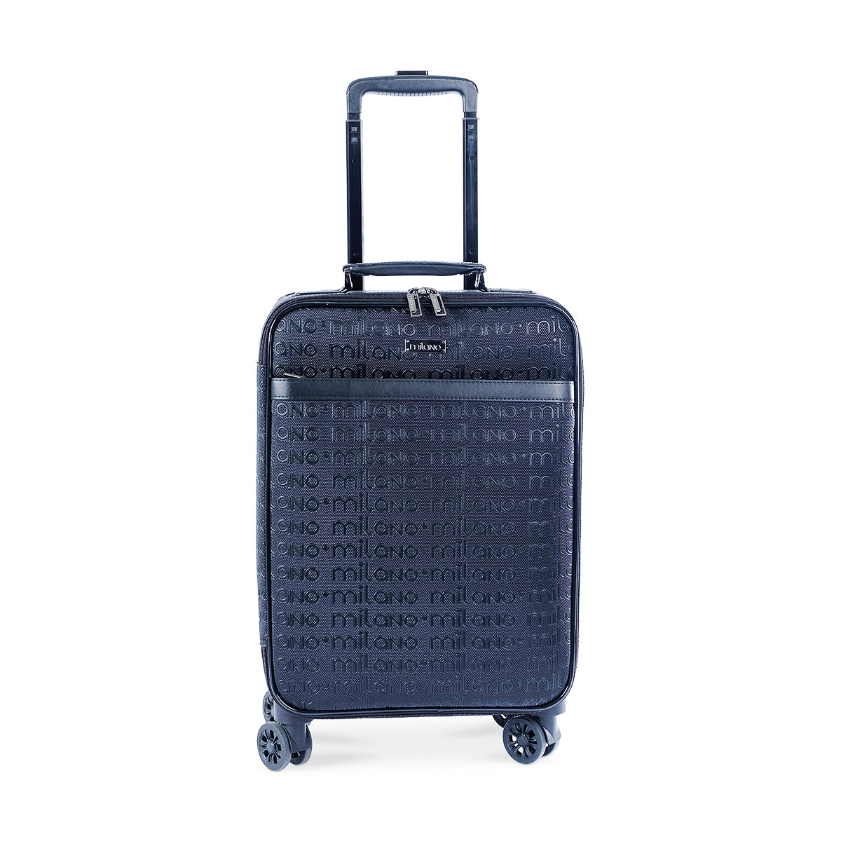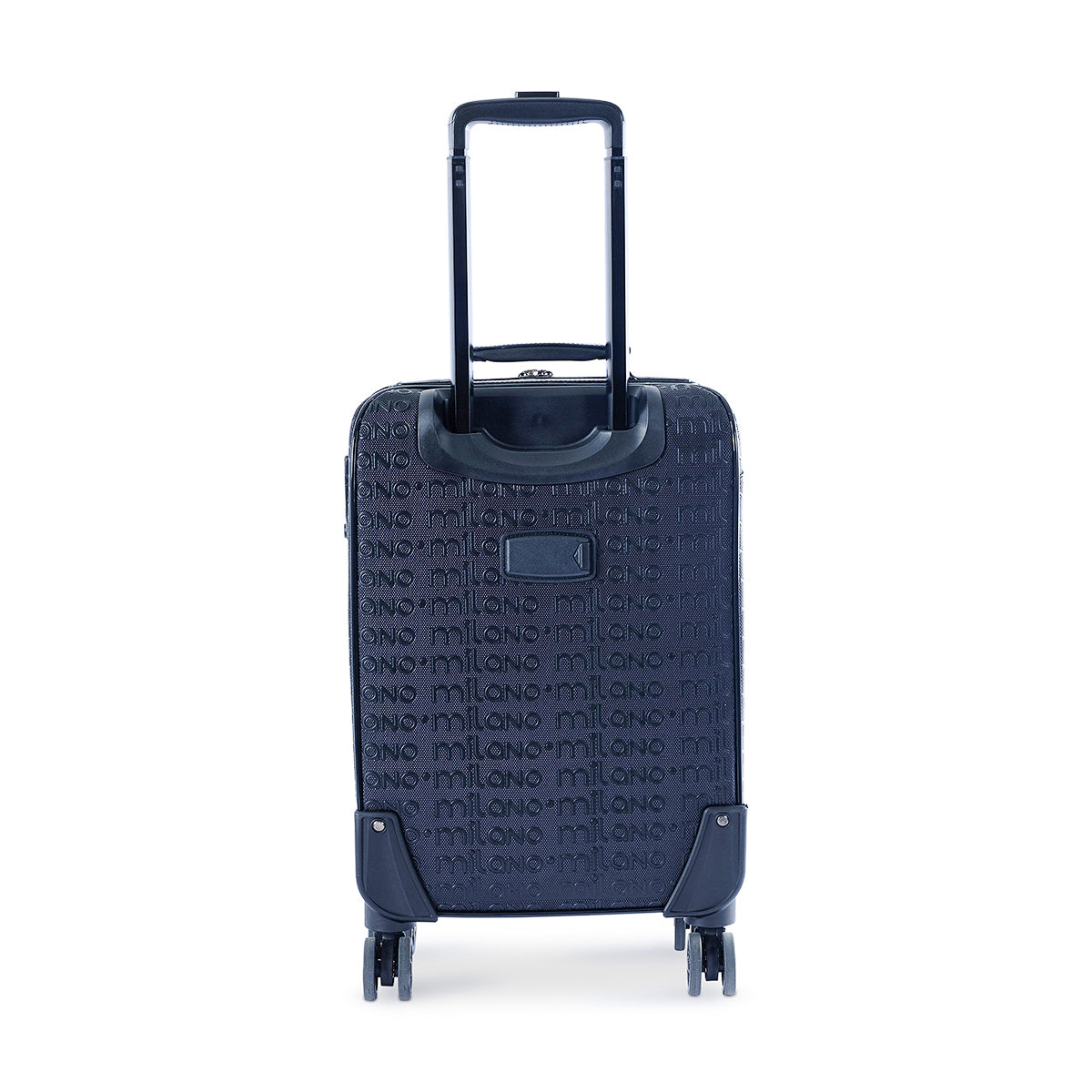 Meet the 'Rebecca' spinner suitcase, a perfect blend of durability and style. Crafted in a classic black finish with a subtle textured pattern, this luggage features 360° spinner wheels and a sturdy telescopic handle. Its minimalist design is completed by a small silver brand plaque.