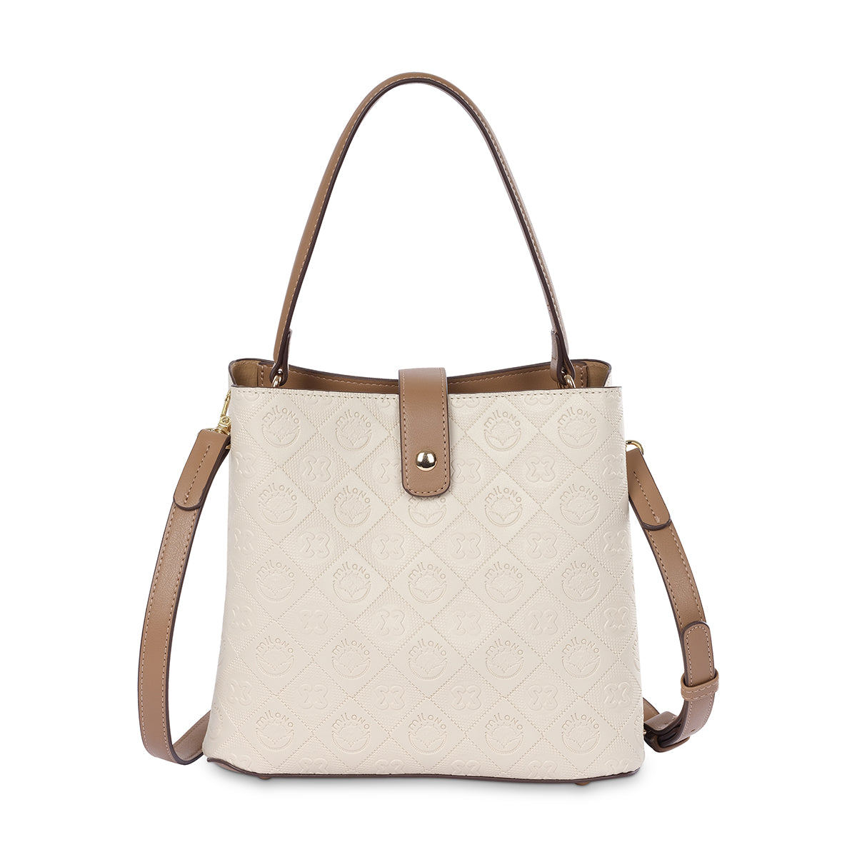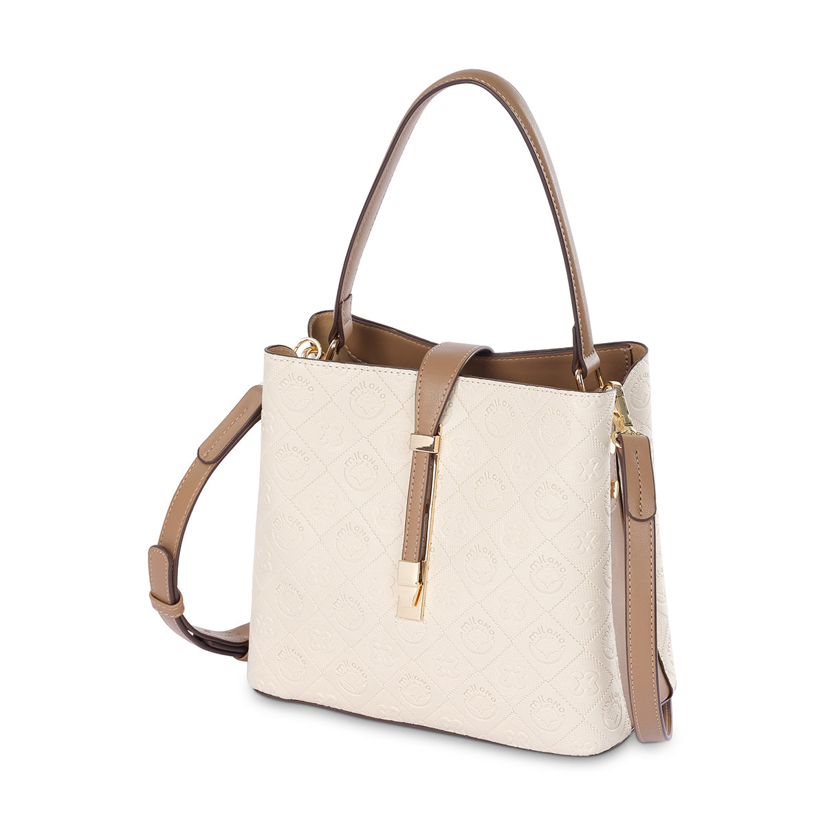 Carry your essentials in style with the Genji embossed tote. This bag features a sleek bucket shape and a sophisticated all-over embossed pattern. Its classic beige color and polished hardware make it the perfect everyday accessory that can effortlessly transition from the office to an evening out.