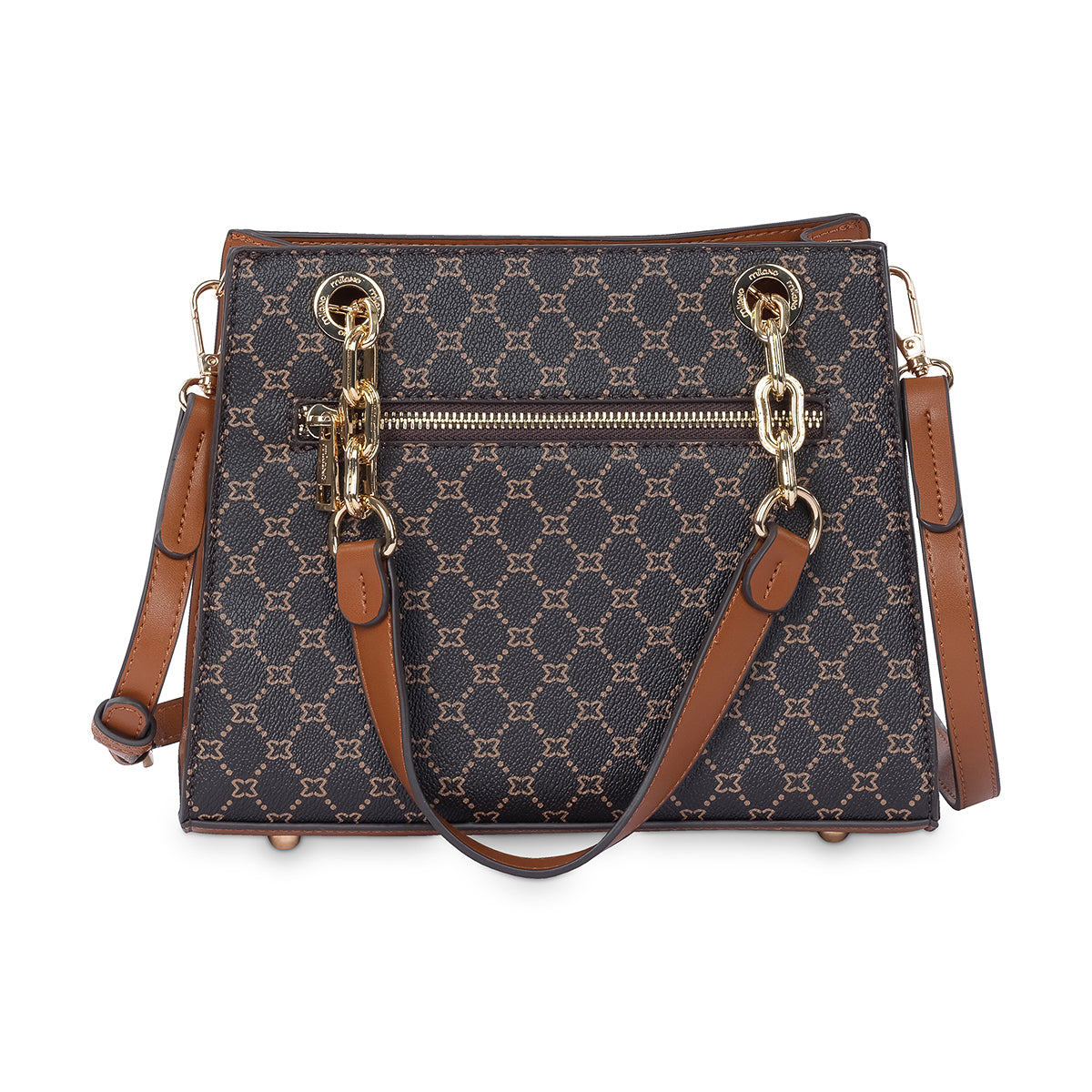 Brown monogram medium tote featuring our signature Milano plate, texturned gold link chain and faux leather handles. With multiple compartments, including a central zip pocket to keep your belonging secure