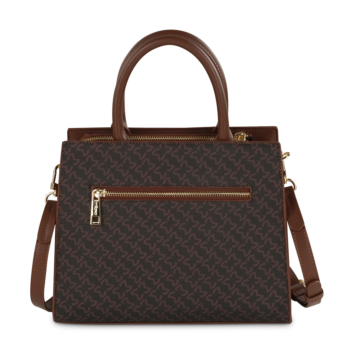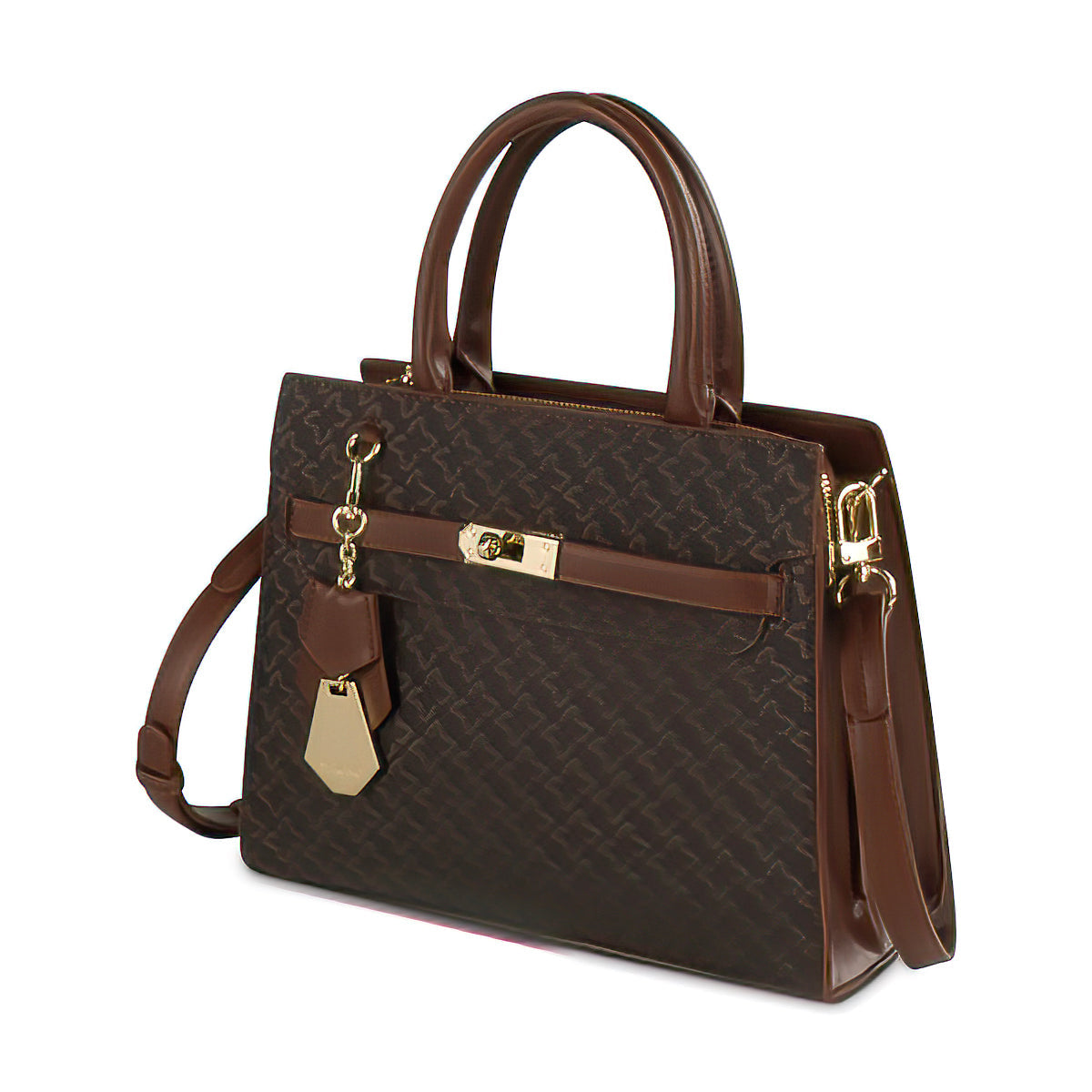 Elevate your look with our sophisticated dark brown tote, featuring an elegant all-over monogram print. This structured bag boasts a refined horizontal band with a central gold-tone lock, complemented by a chic "M" charm. With comfortable top handles and a versatile detachable strap, it's a luxurious and practical choice for any occasion.