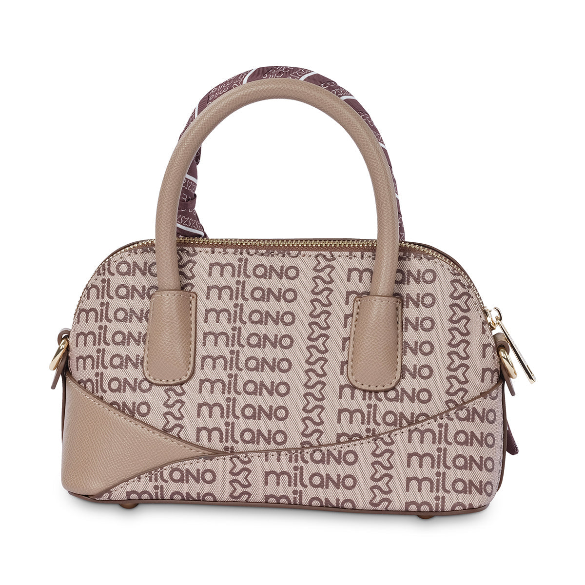 Discover timeless elegance with our structured beige and brown "Milano" logo Boston bag. Featuring distinctive vertical text stripes and a chic scarf-wrapped handle, this bag offers sophisticated style. With a secure zip top and a versatile detachable strap, it's the perfect blend of fashion and functionality for any occasio