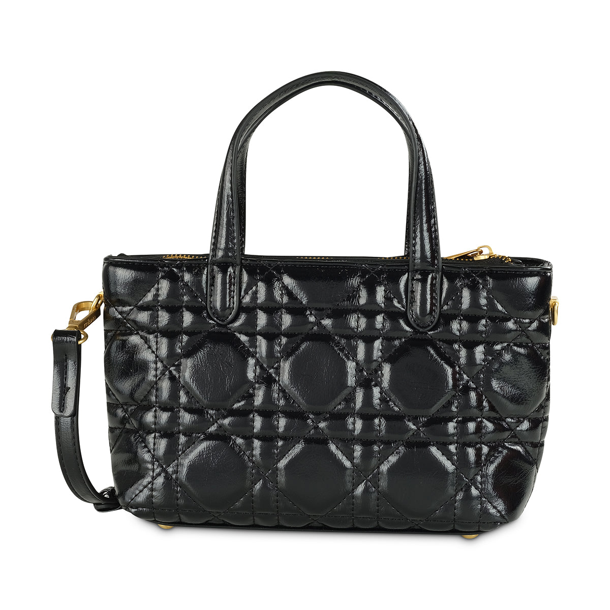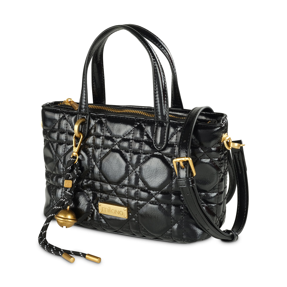 Introducing the 'Berrie' structured tote, a new-season essential. This bag commands attention with its high-shine black finish and intricate quilted diamond pattern. Thoughtful details like the elegant gold-tone hardware, signature 'M' logo charm, and a decorative tassel with a metallic orb add a touch of modern luxury. Complete with both a top handle and a detachable shoulder strap, the 'Aura' bag is a chic and functional piece designed to effortlessly carry you through any occasion.
