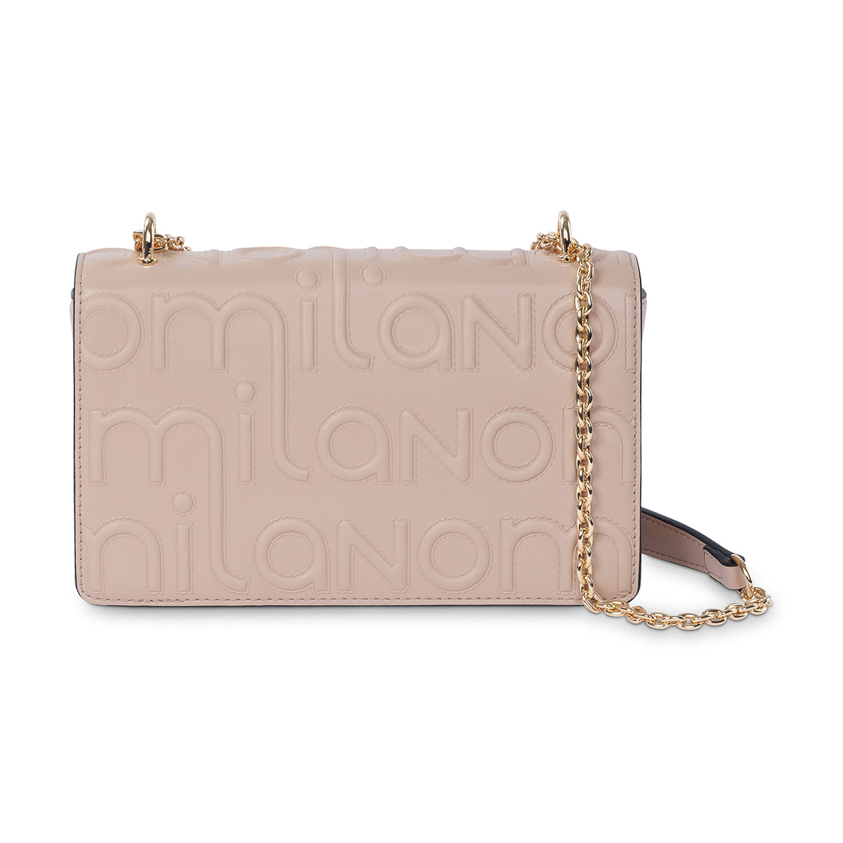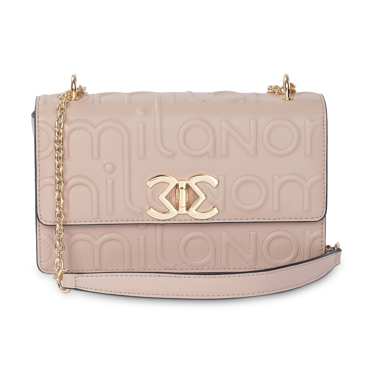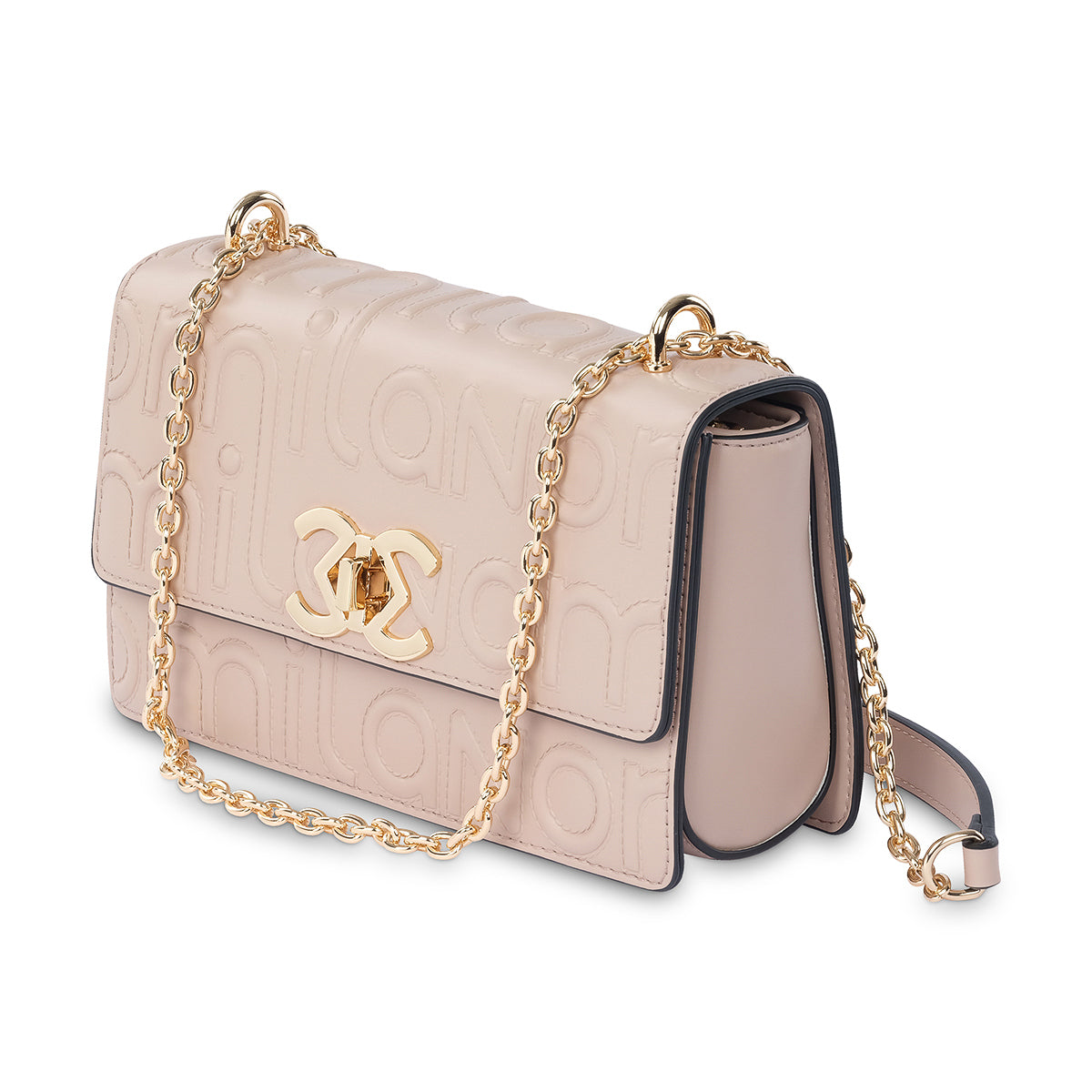 Elevate your look with the 'Milano' handbag, a structured piece that blends classic elegance with a modern edge. This bag is crafted from a luxurious nude material with a striking, embossed pattern on the front flap. The polished gold-tone chain strap and iconic logo clasp create a sophisticated finish, perfect for day or nigh