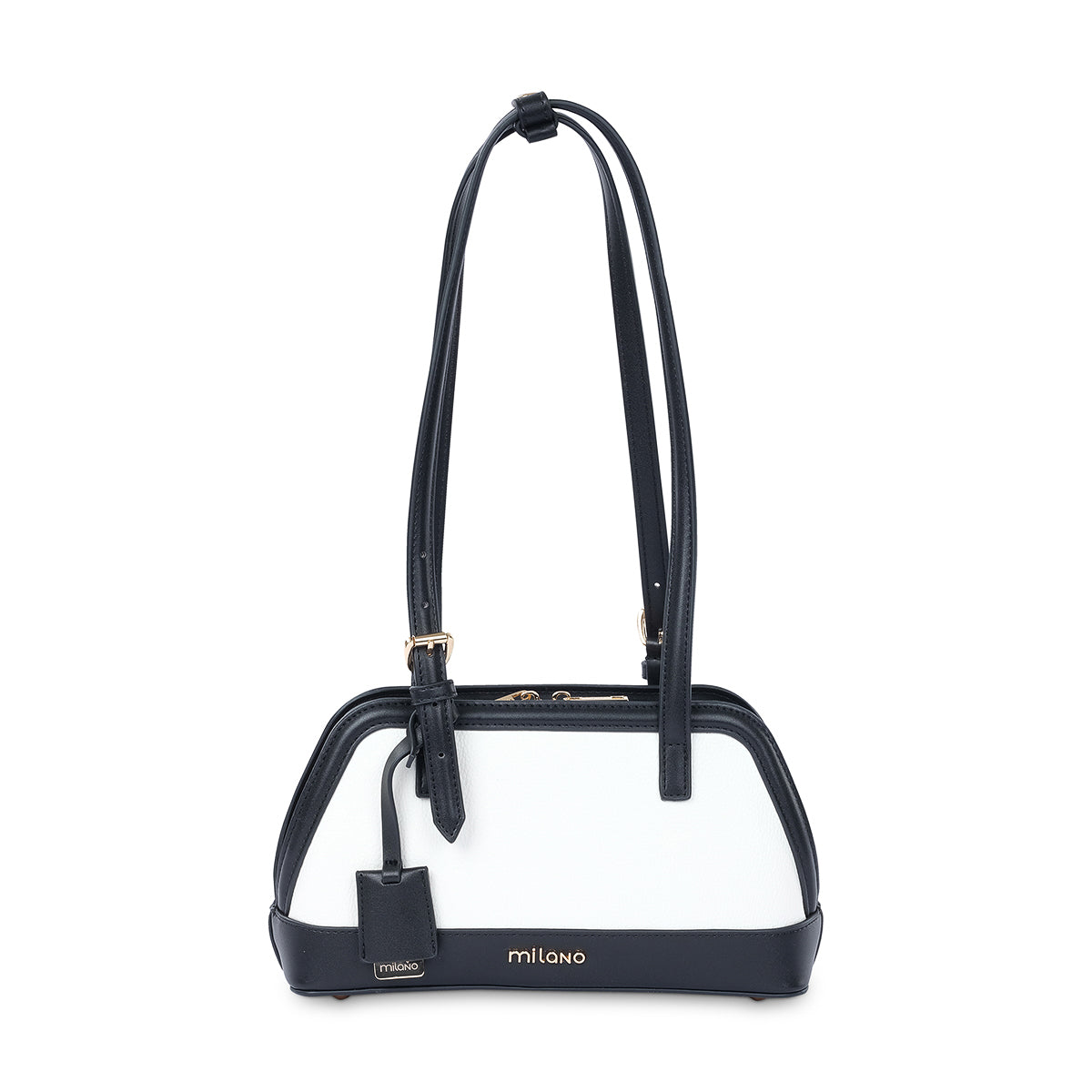 A modern, two tone shoulder bag with grab handles and a detachable, adjustable long strap. Featuring our Milano logo plate and a premium, detachable luggage tag. The perfect bag to complement monochrome outfits this season
