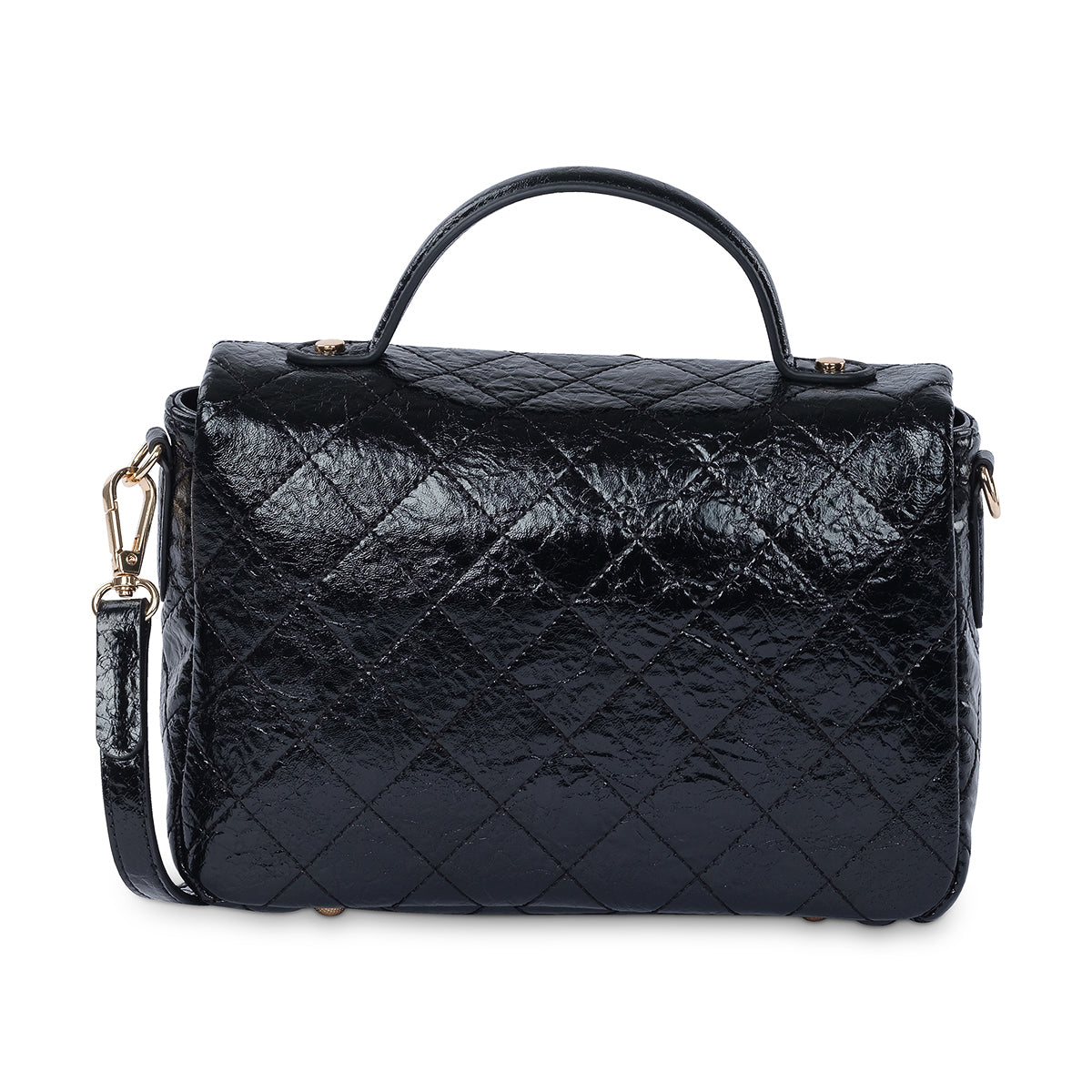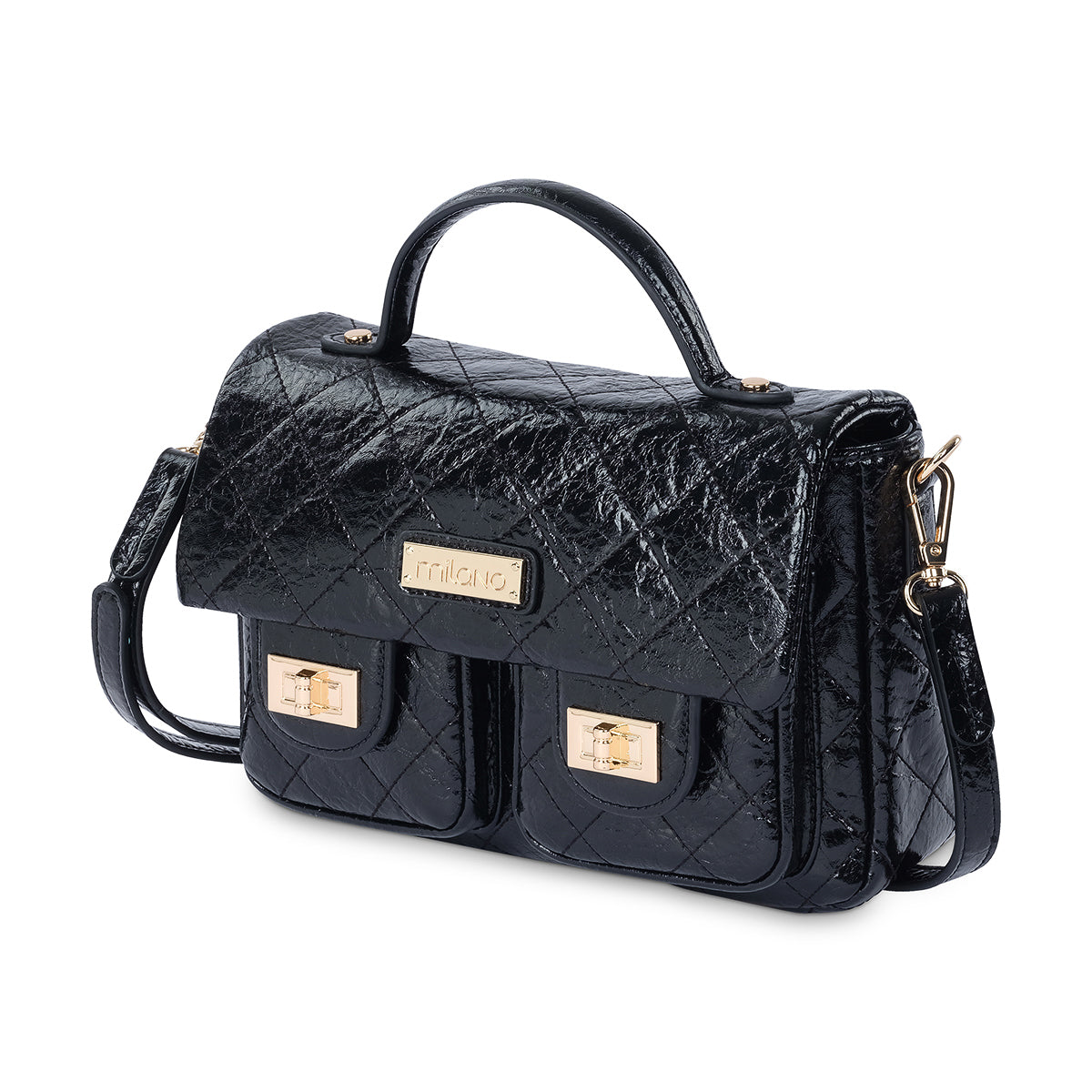 The 'Jamy' quilted bag is a sophisticated statement piece with a touch of classic charm. Crafted in sleek black with a high-shine finish, this bag features a prominent top handle and striking gold-tone hardware. The front is adorned with two elegant flap pockets, adding both style and practicality to its timeless design.