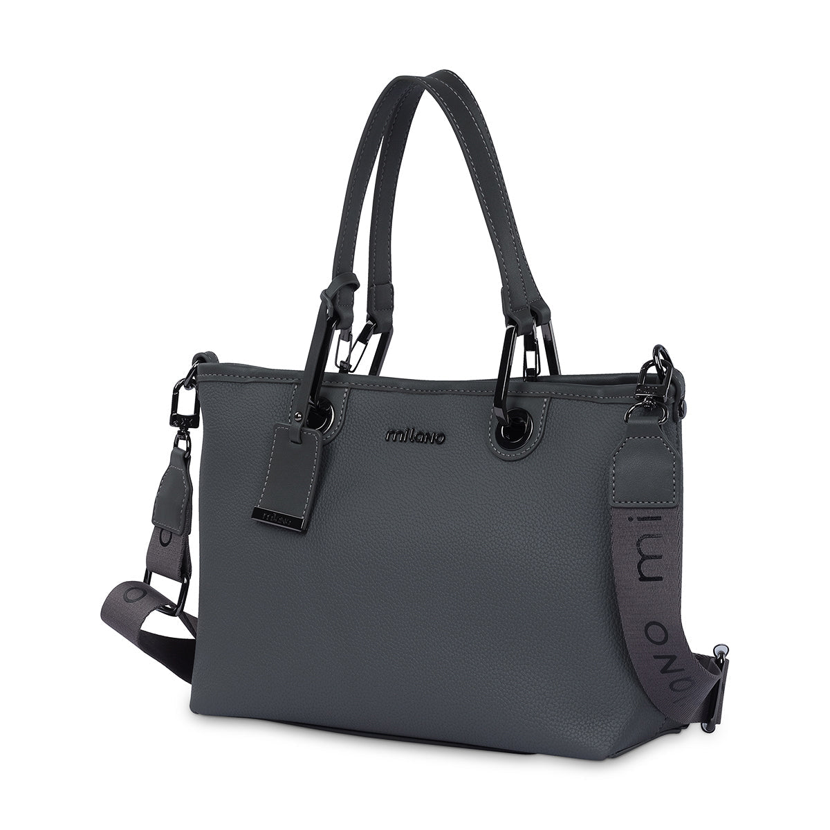 Elevate your look with the 'Milano' tote, a handbag that blends professional style with elegant details. This bag is crafted from a high-quality material with a subtle pebble grain texture and features polished silver-tone hardware and a distinctive brand tag. The spacious interior and multiple carrying options make it an ideal choice for both the office and weekend getaways.
