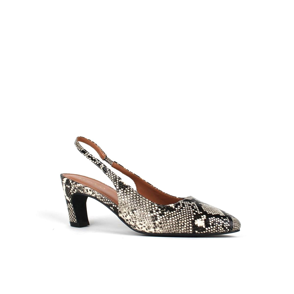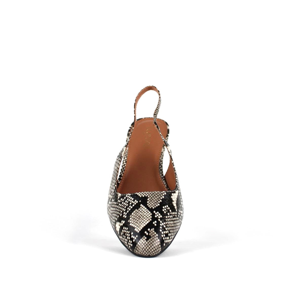 Iya slingback pumps feature a striking snakeskin print in a versatile blend of beige, black, and white. It has modern almond toe and a flared block heel. An elasticated slingback strap ensures a perfect fit, making them a bold yet elegant choice for a variety of occasions