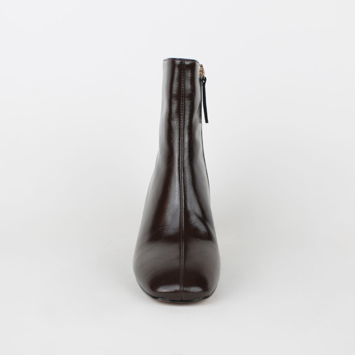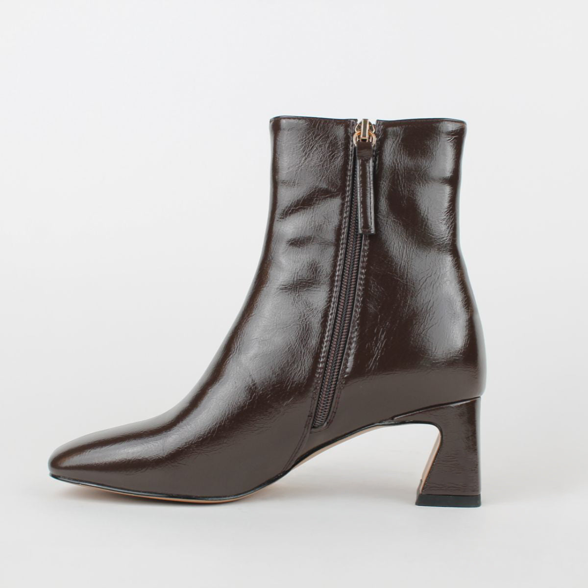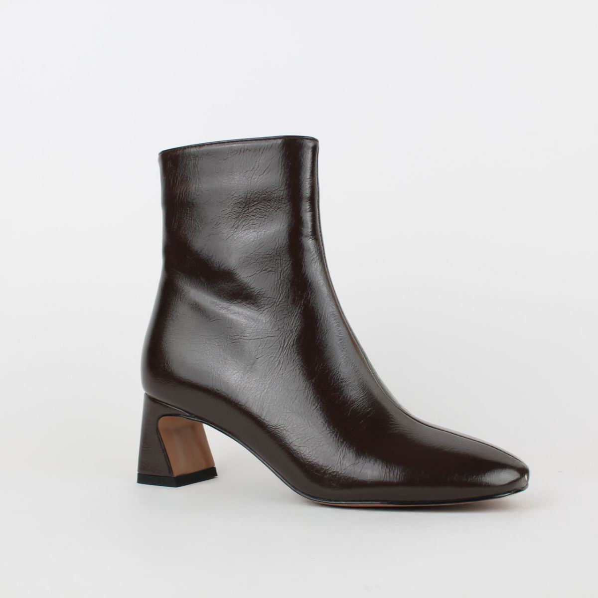 A sleek, modern ankle boot with a patent-leather look, featuring a unique sculptural heel and a discreet inside zipper for easy on and off.