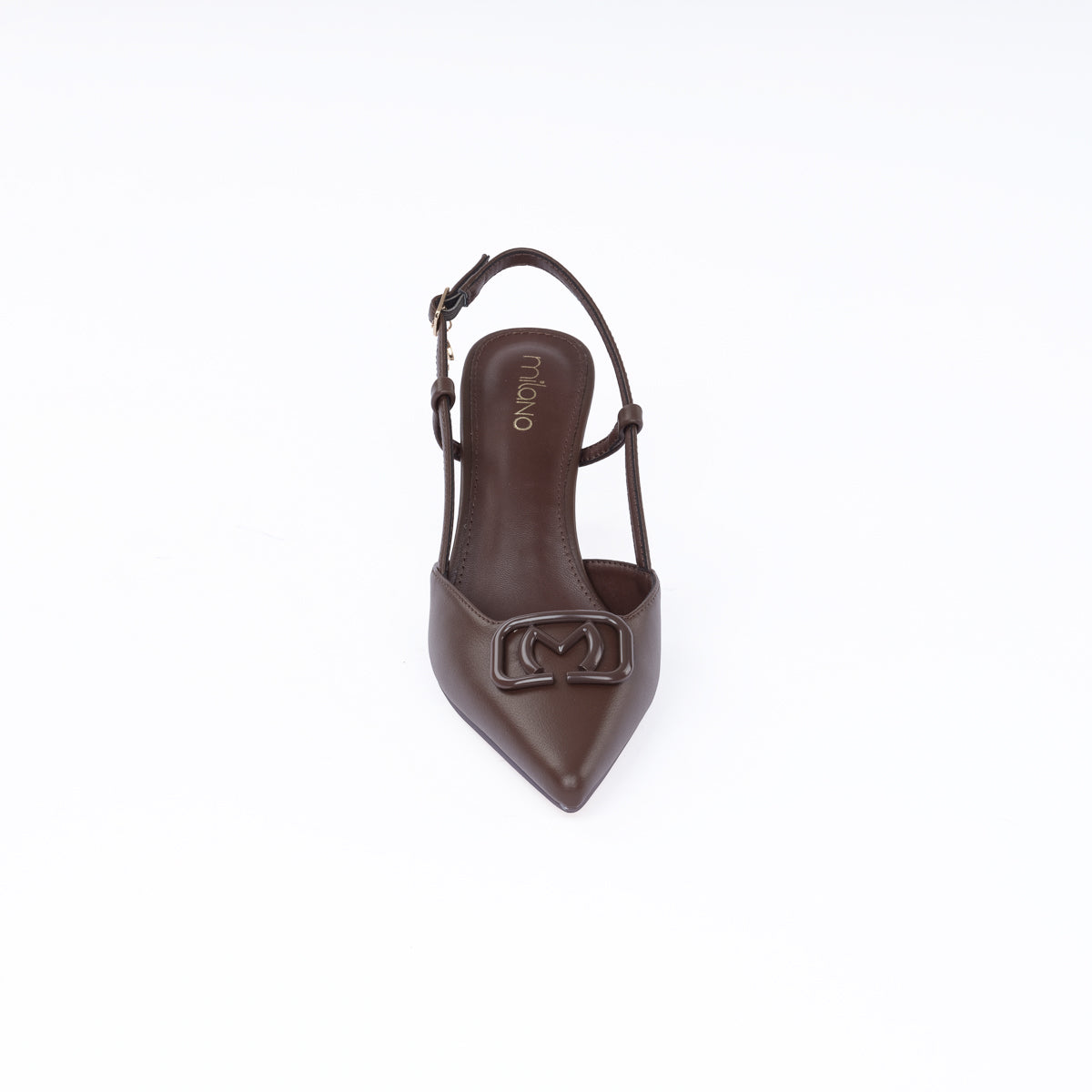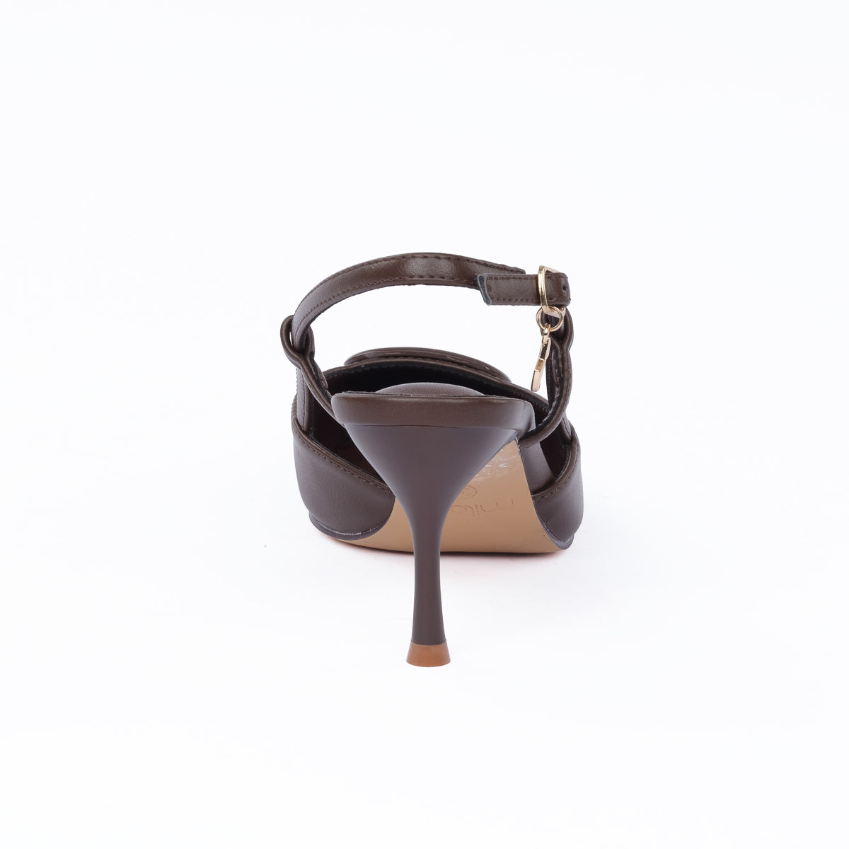 Vata is an elegant, sophisticated dark chocolate brown slingback pump featuring a sharp pointed toe and a sleek, medium stiletto heel. It is detailed with an adjustable slingback strap