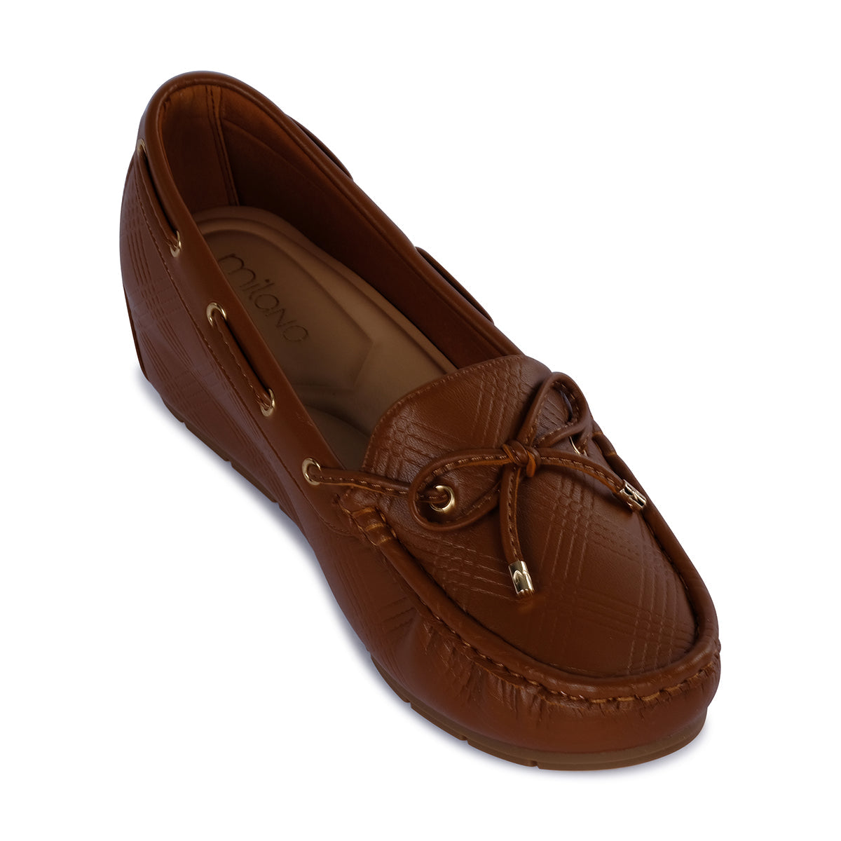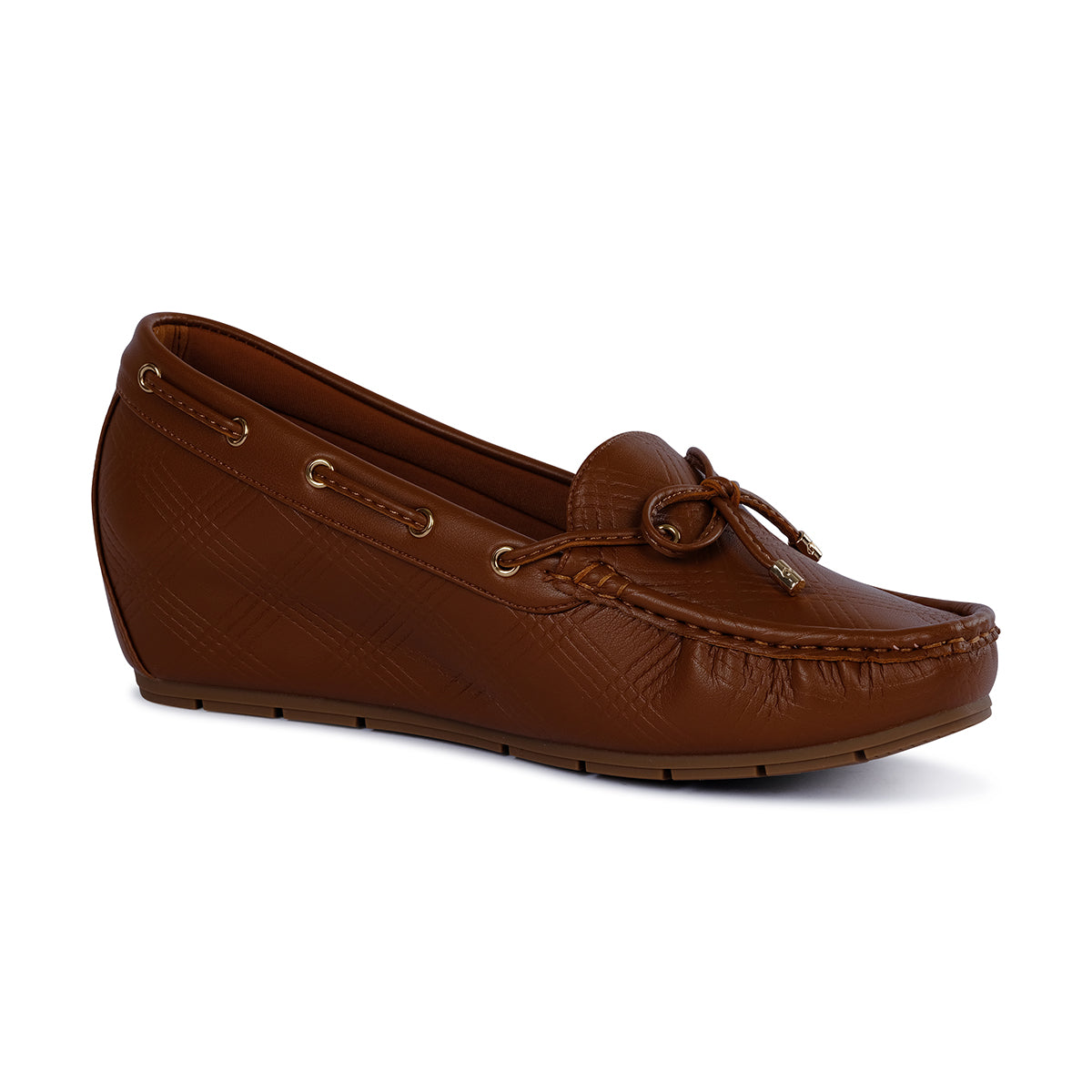 Chic brown moccasins featuring gold-tone eyelet detailing and bow accents, paired with a subtle wedge heel for added sophistication and comfort.