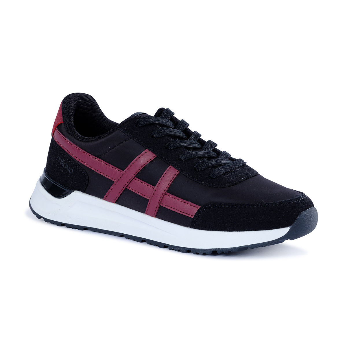 Sporty meets sleek—black sneakers with bold maroon accents and a cushioned white sole for all-day comfort and effortless style.