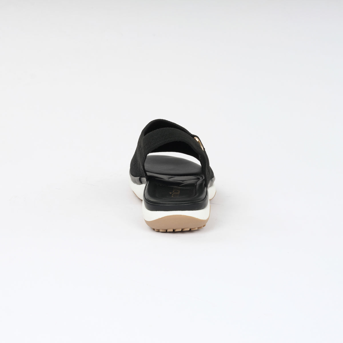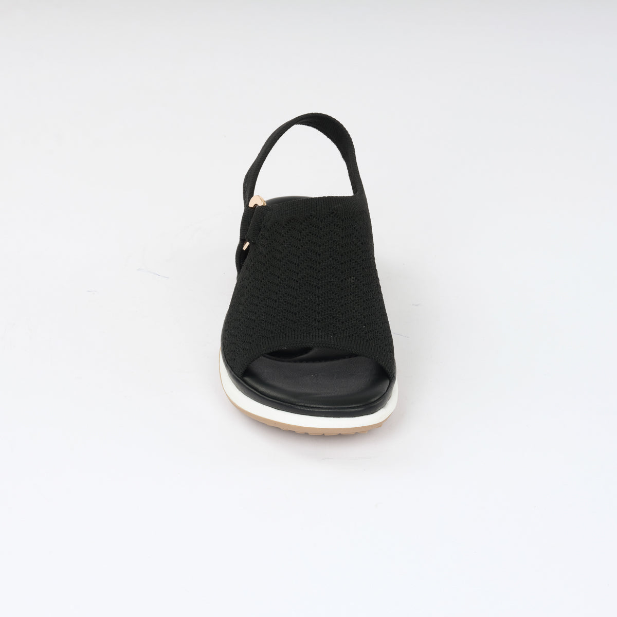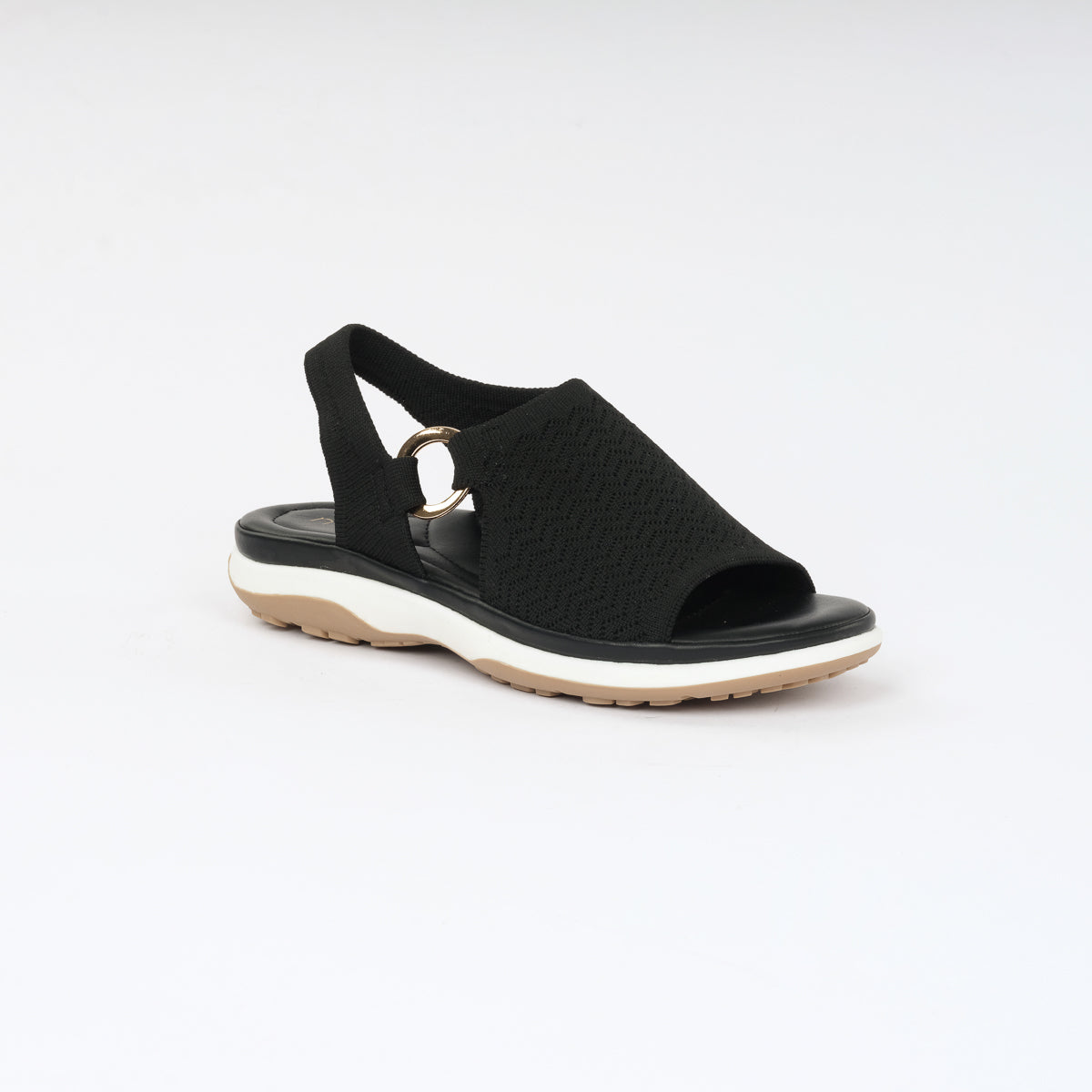 Black open-toe sandals with a textured upper, metallic ring accents, and a cushioned sole for all-day comfort and modern style.