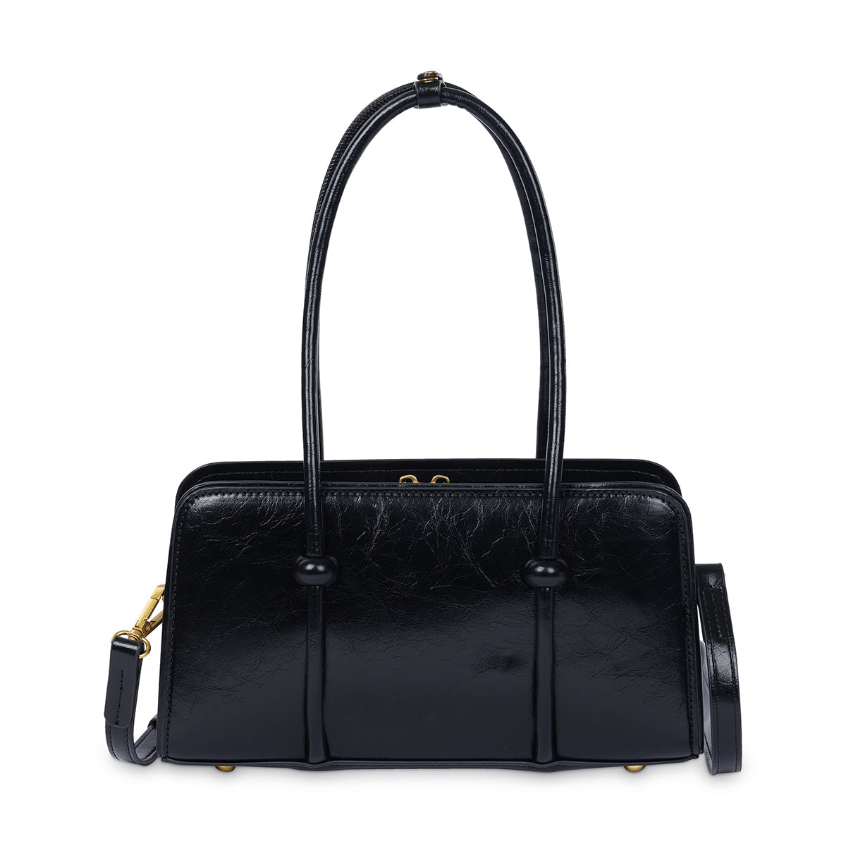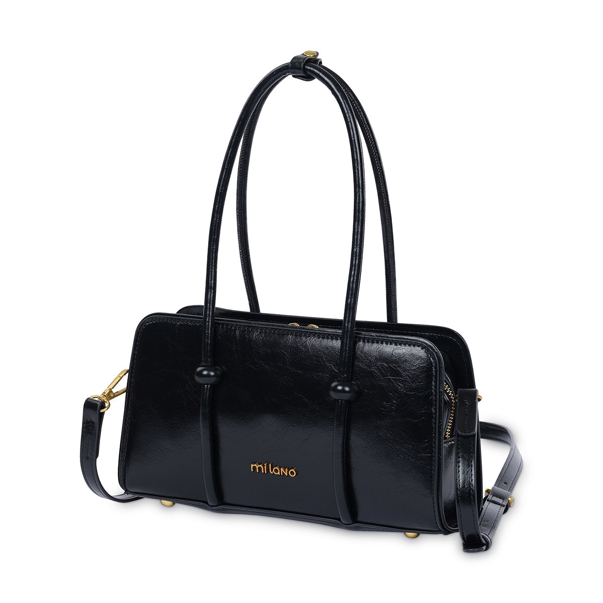 The 'Bella' bag features a chic, minimalist design with a sleek rectangular body and slim top handles. Its simple silhouette and gold-tone logo make it a timeless accessory that works for any occasion. The 'Bella' bag in a rich dark brown offers a warm, sophisticated look. It’s an ideal piece to pair with a variety of outfits, from professional to casual.