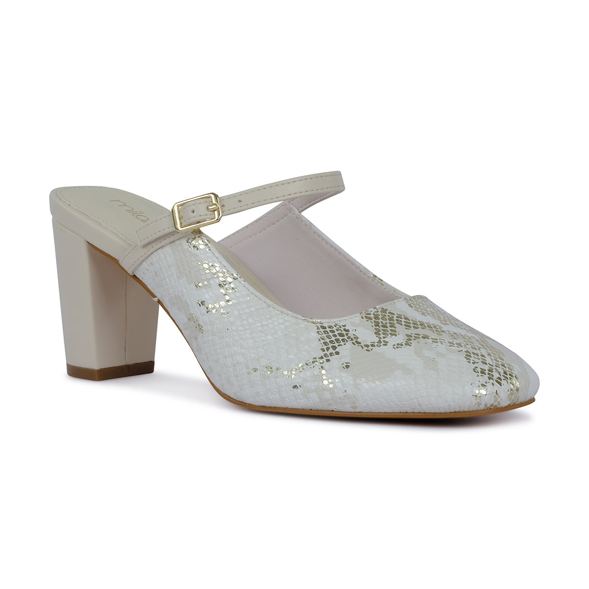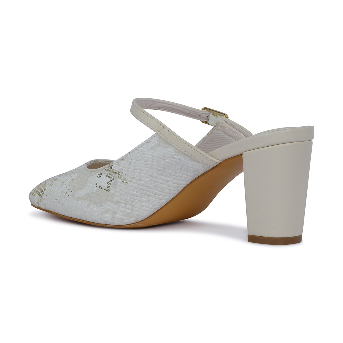 Elegant heeled mule in a soft cream tone, featuring a shimmering textured upper, adjustable strap, and sturdy block heel. Perfect for dressy occasions and effortless chic styling.