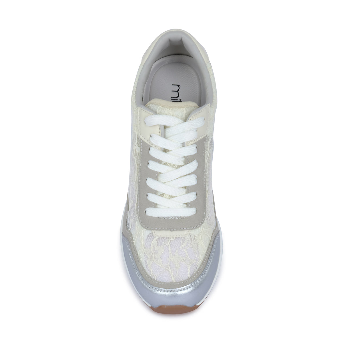 Modern sneakers featuring delicate lace panels with metallic silver accents. Built with a cushioned insole and a sturdy white sole for comfort and style. Perfect for casual outfits with a chic edge.