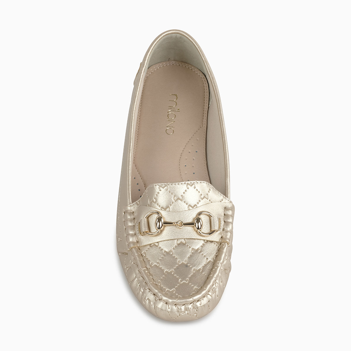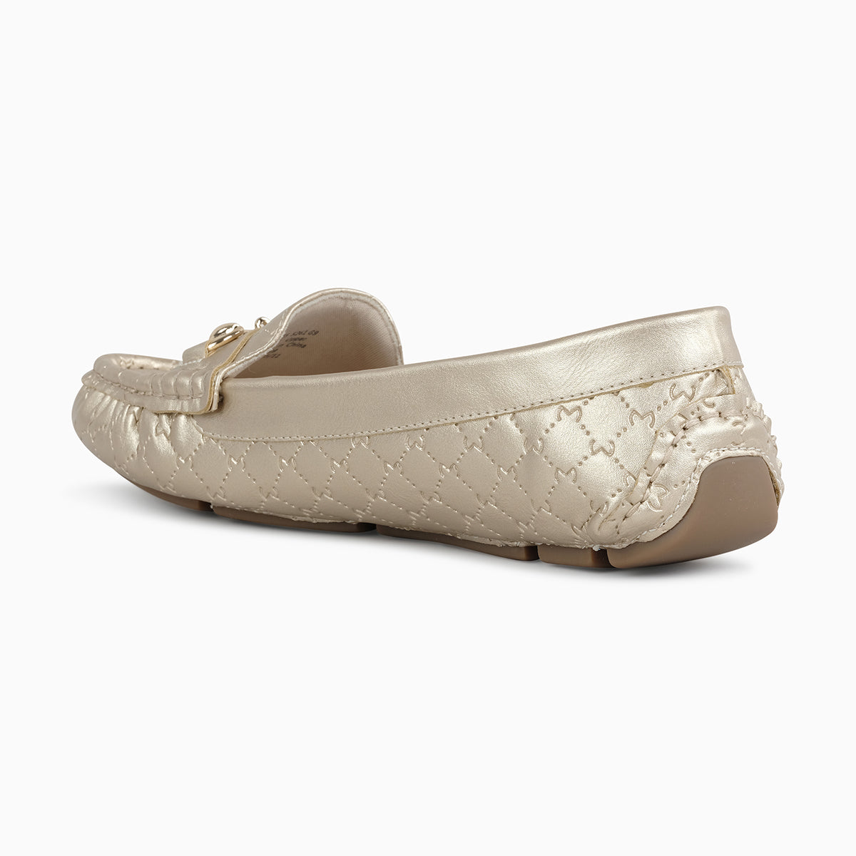 Elegant metallic loafers with a quilted design and polished bit detail. Features a cushioned insole for comfort and a flexible rubber sole for durability. Perfect for casual or semi-formal wear