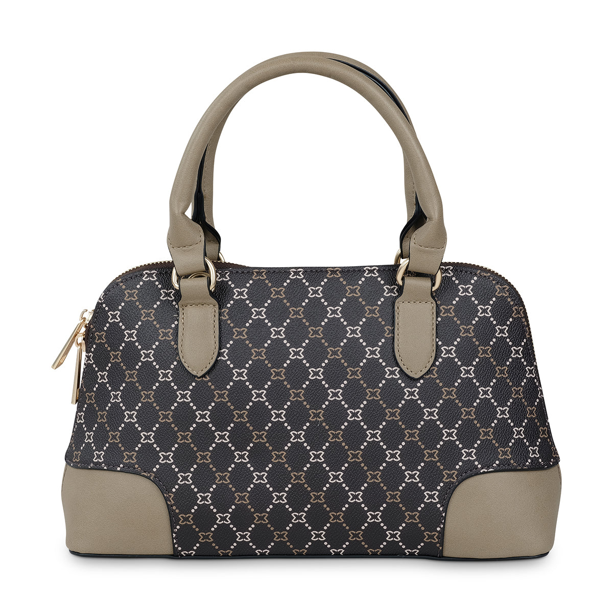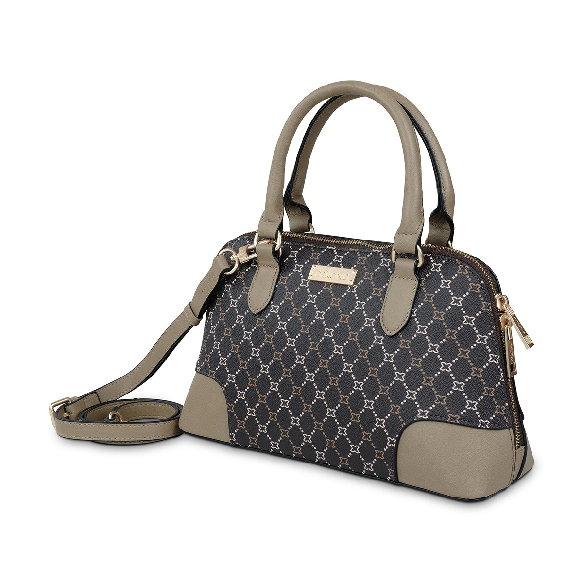 Beige monogram crossbody, contrast tan front strap closure with striking contrast stitch and hardware, long detachable shoulder strap, can be worn as a clutch or crossbody bag, internal pockets for cards