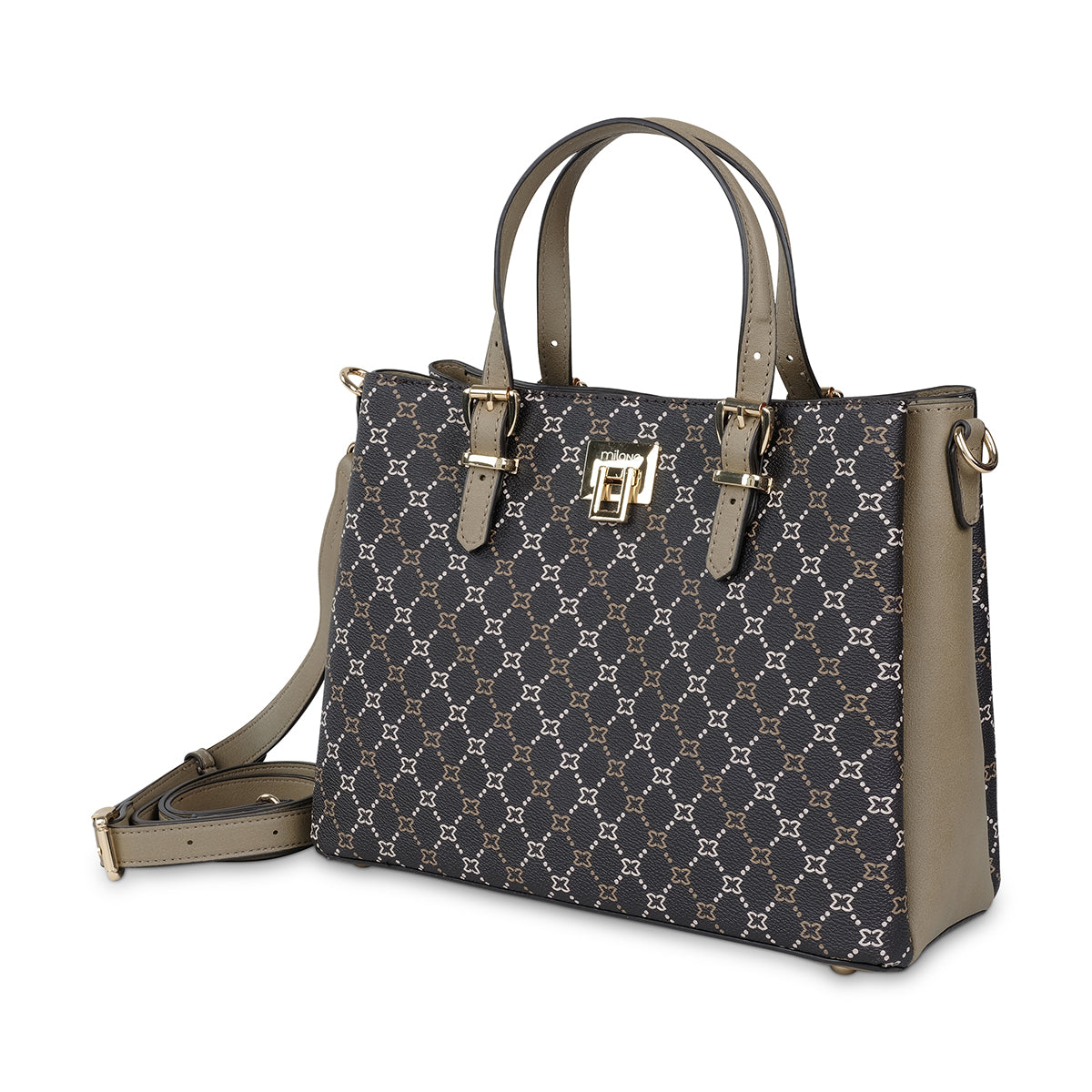Elegant and timeless, this brown monogram tote bag is accented with a sleek gold drop lock and taupe contrast handles. Its structured silhouette opens to a spacious interior with multiple pockets and card slots, making it both stylish and practical for day or night outings