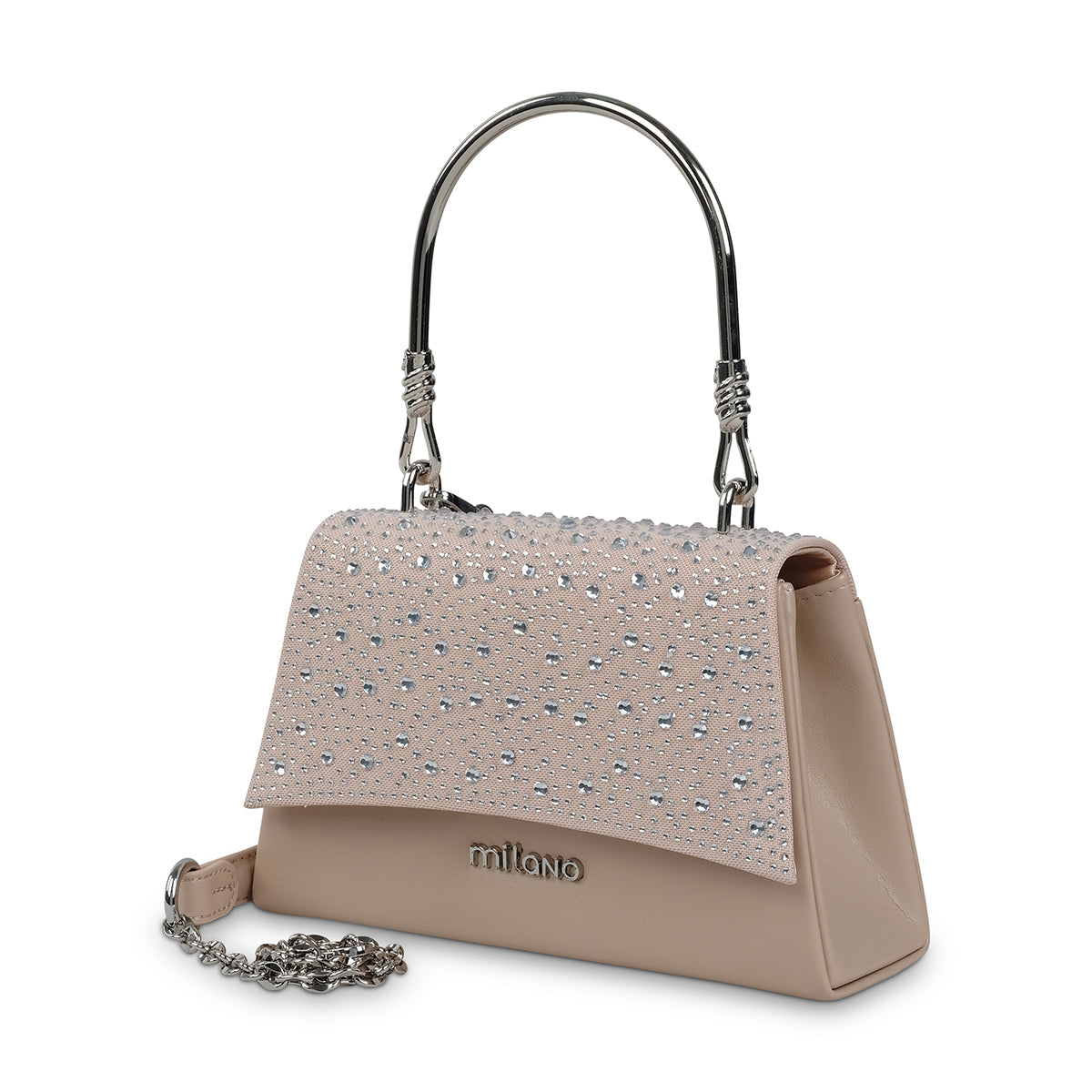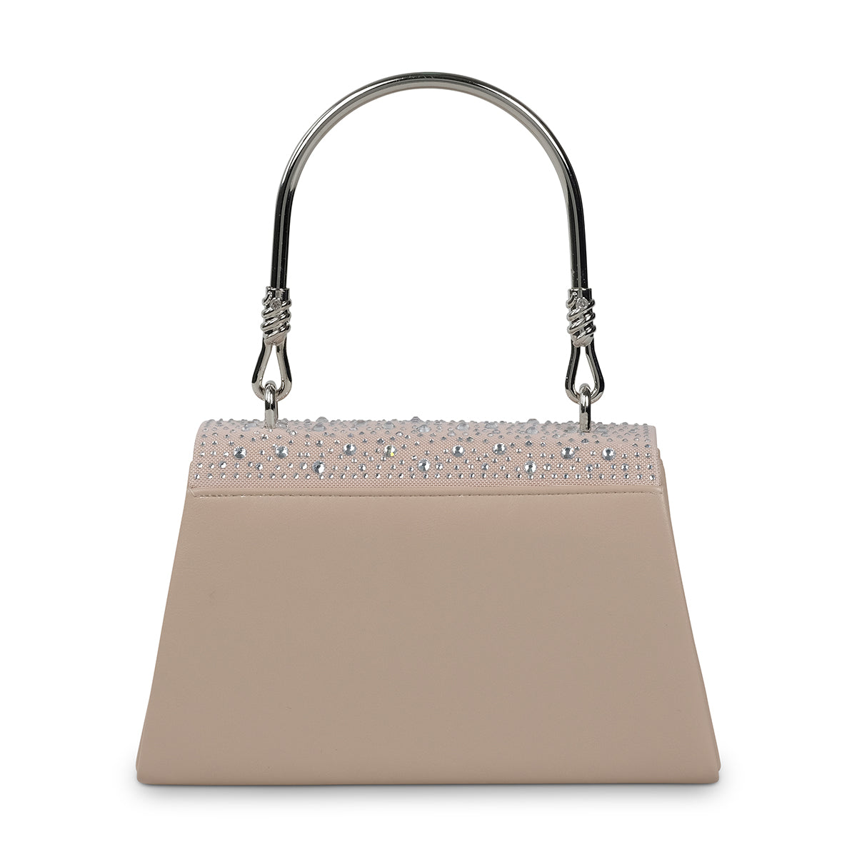 This elegant beige top handle bag features a sophisticated design with diamante embellishment, knotted top handle and a stylish crossbody chain, offering versatile carrying options. Its neutral tone and sleek silhouette make it a chic accessory that complements any outfit