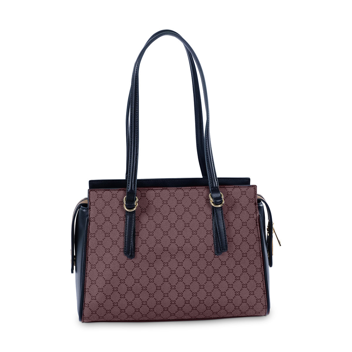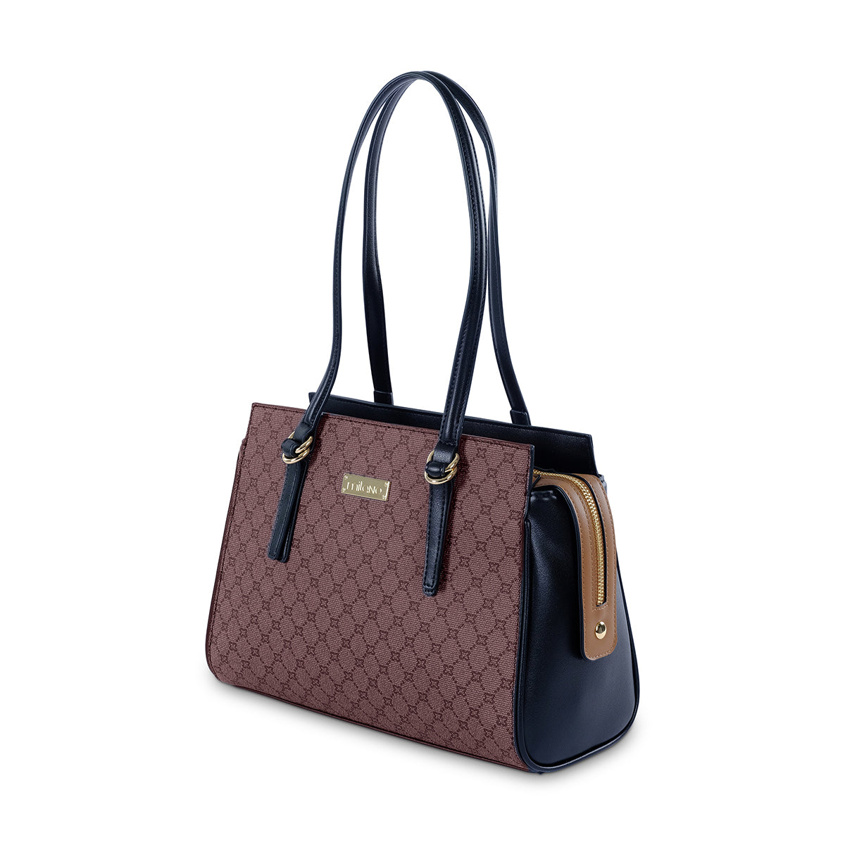 The 'Michelle' monogram tote is a timeless accessory that adds a professional finish to any outfit. This structured bag features an elegant monogram pattern on the main body, framed by chic black trim and handles. The spacious interior and classic silhouette make it perfect for carrying your essentials with ease.