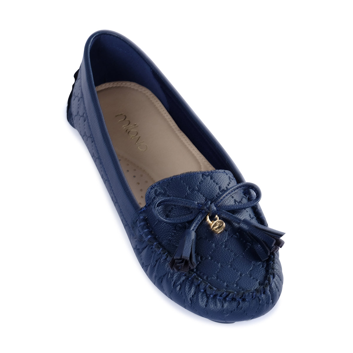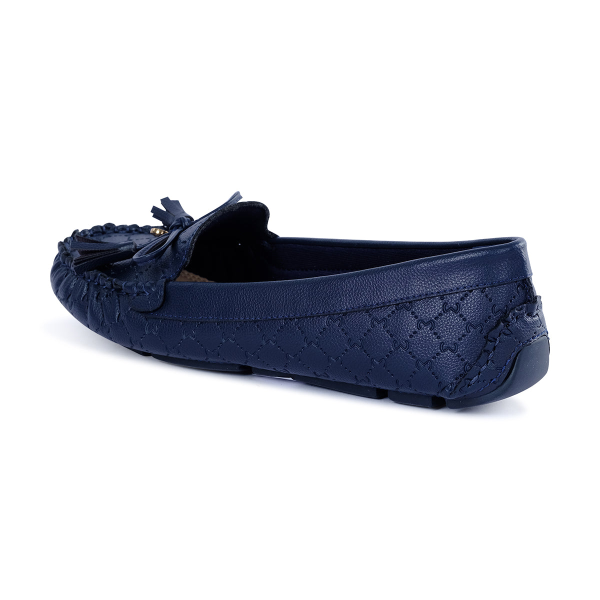 Elegant navy leather moccasins featuring a delicate bow accent and hand-stitched detailing. A chic slip-on style that combines comfort with refined sophistication.