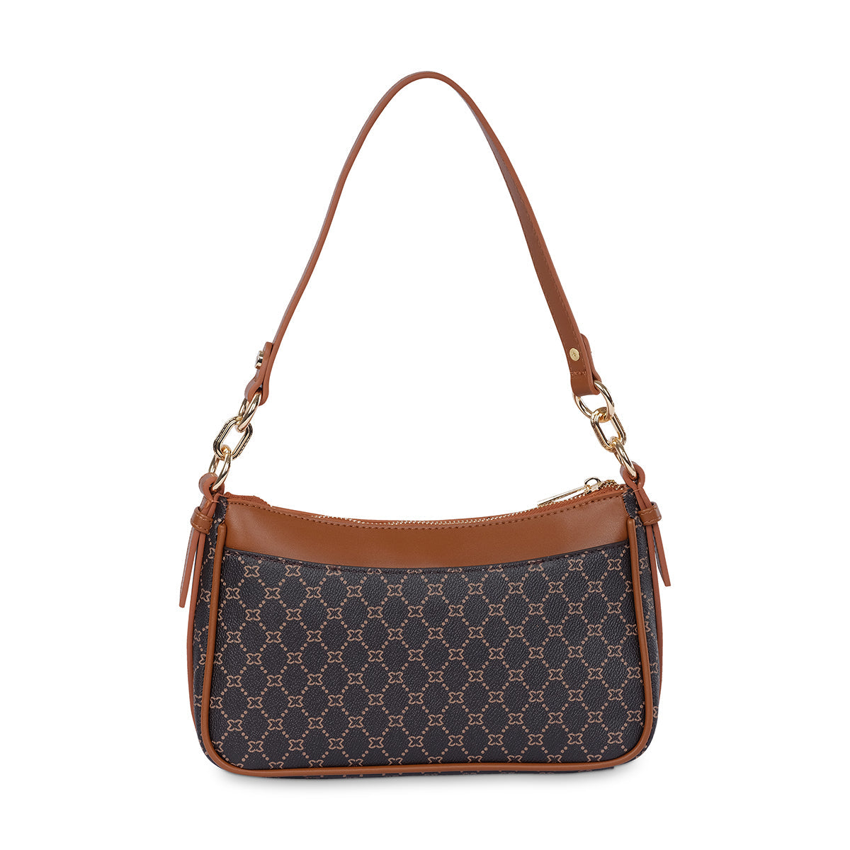 Brown monogram shoulder bag featuring Milano branded plate, textured gold links and faux leather handles. With internal pockets and external slip pocket to organise your daily essentials