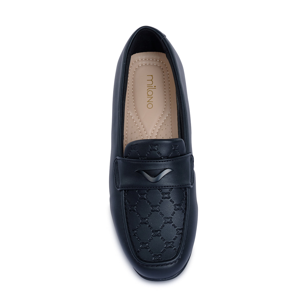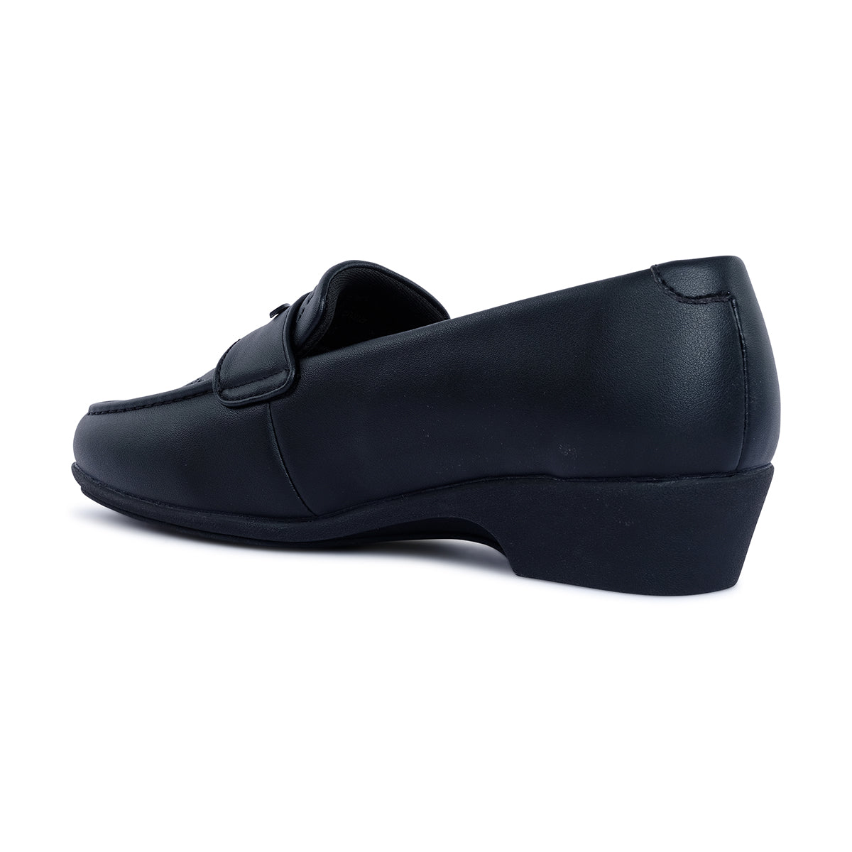 Elegant black loafer with a smooth finish and low wedge heel, accented by a sleek strap detail. A timeless design blending comfort and understated sophistication