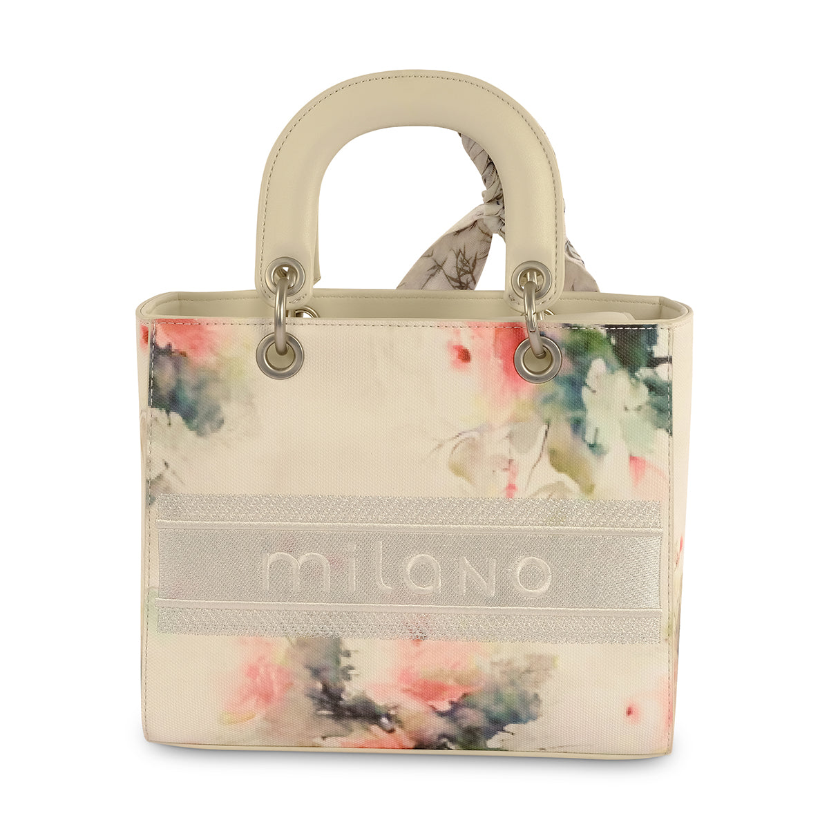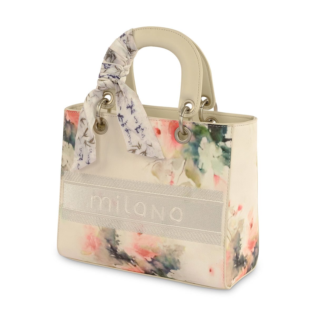 The Nicole Mini Tote is a sophisticated and charming accessory. This structured bag features a clean, boxy silhouette with an elegant floral print, bringing a fresh and artistic feel to your look. The wide top handle and a matching scarf add a touch of playful style, making it a perfect statement piece.
