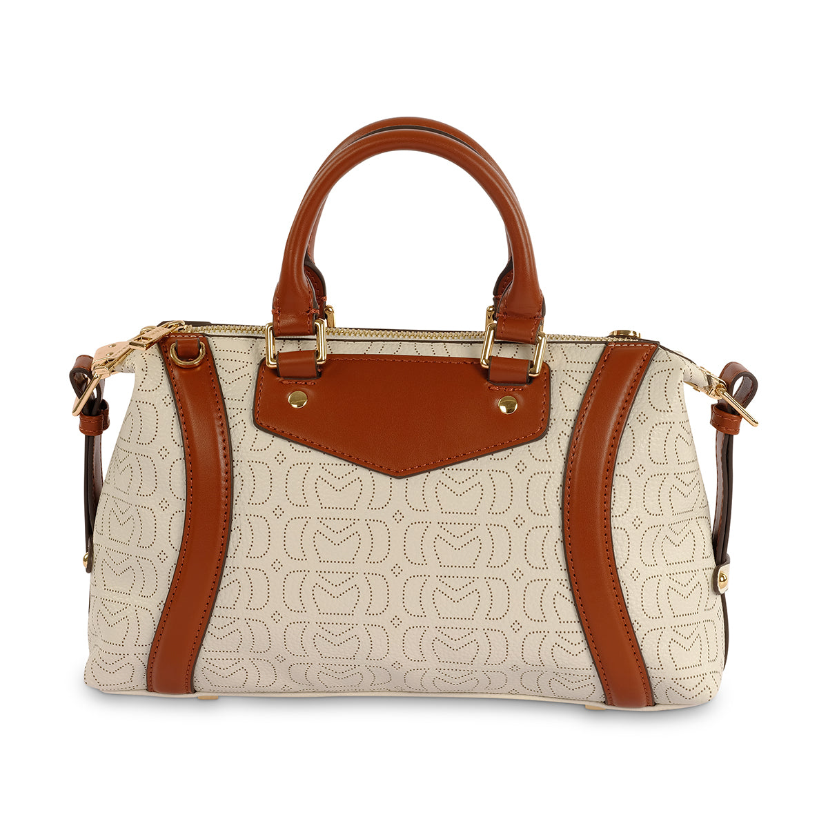 A premium ivory printed monogram barrel bag featuring contrast brown faux leather, detachable luggage tag and gold Milano branding. With phone pockets and an adjustable long strap for dual styling.