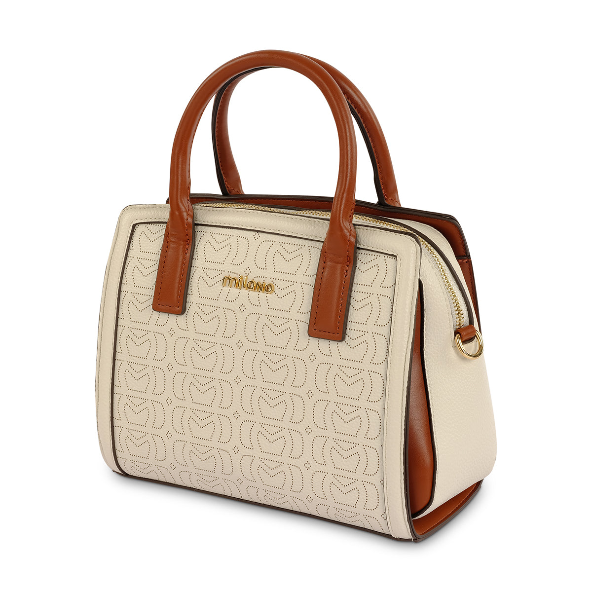 A stylish Ivory printed monogram tote with premium hardware and detachable luggage tag. Featuring an adjustable shoulder strap, Milano branding and multiple compartments for maximum functionaility