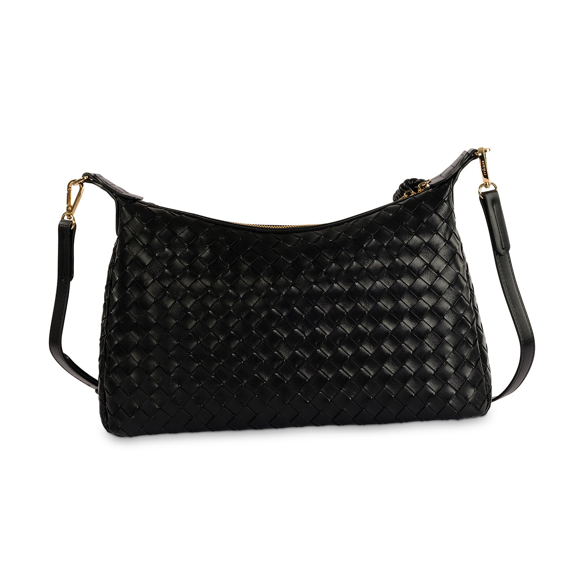 A contemporary black weave details bag featuring premium gold hardware and milano branding, with zip closure for added security. Comes with a detachable, adjustable long strap.