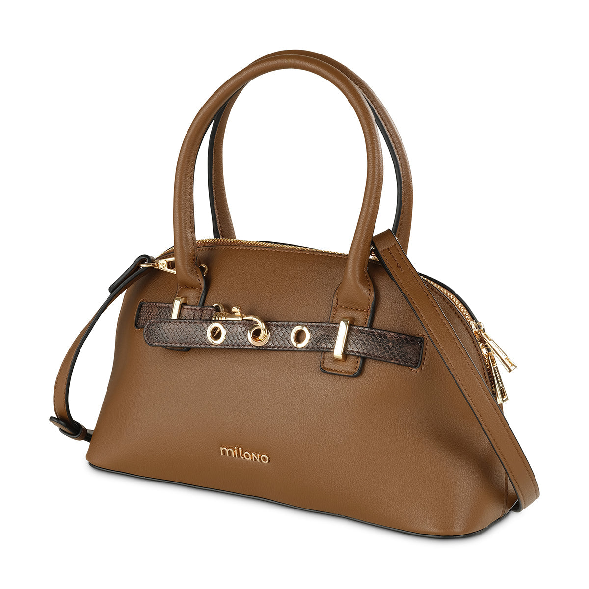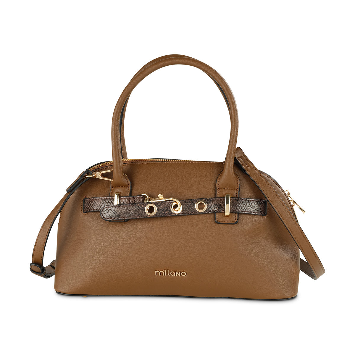 Elevate your ensemble with our sophisticated dark brown/taupe structured dome bag. Its classic silhouette is beautifully accented by a distinctive gold-tone horse-bit inspired buckle and a subtle "Milano" logo. Complete with comfortable top handles and a versatile detachable strap, this bag is a chic and functional choice for any occasion.